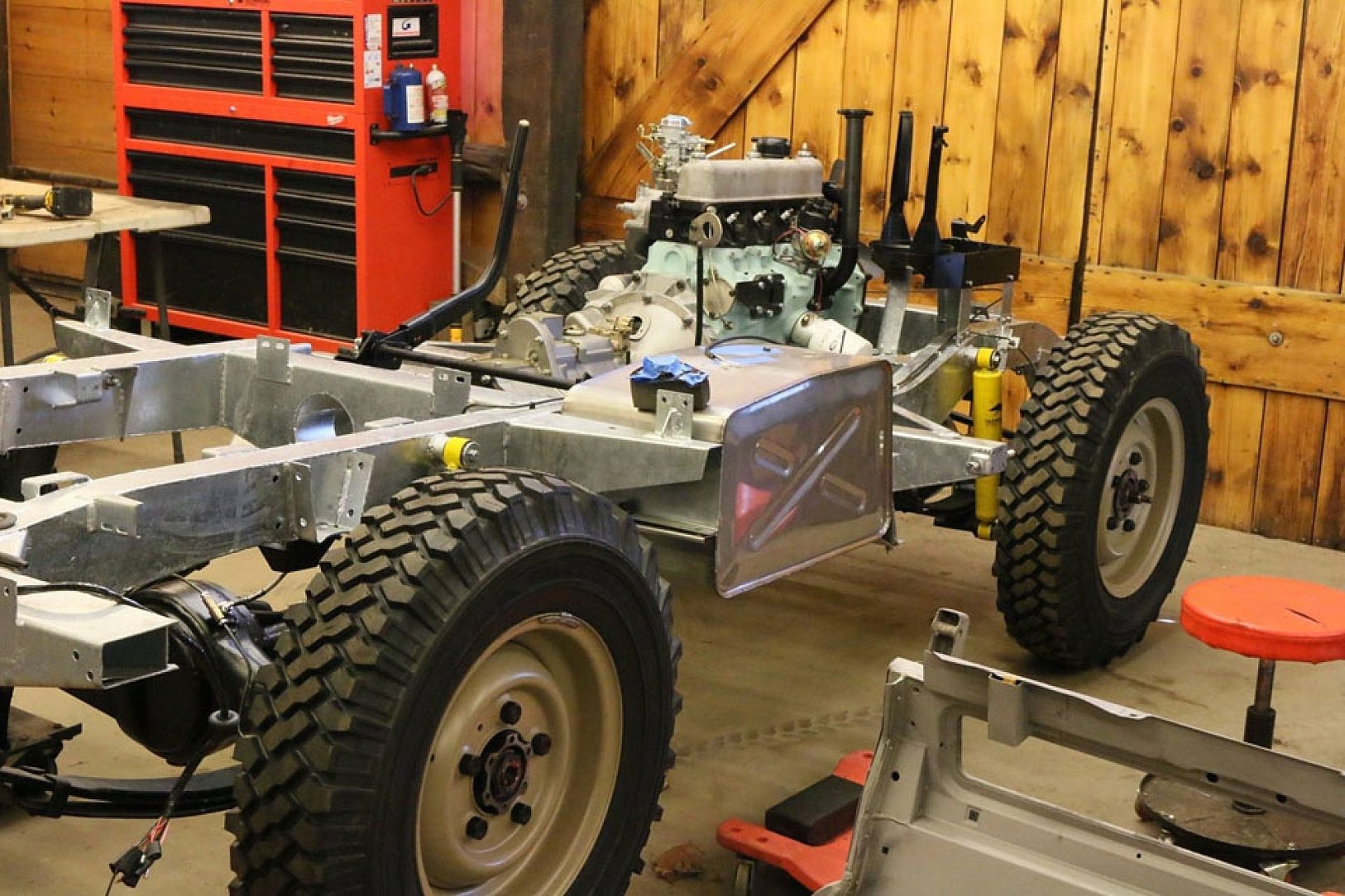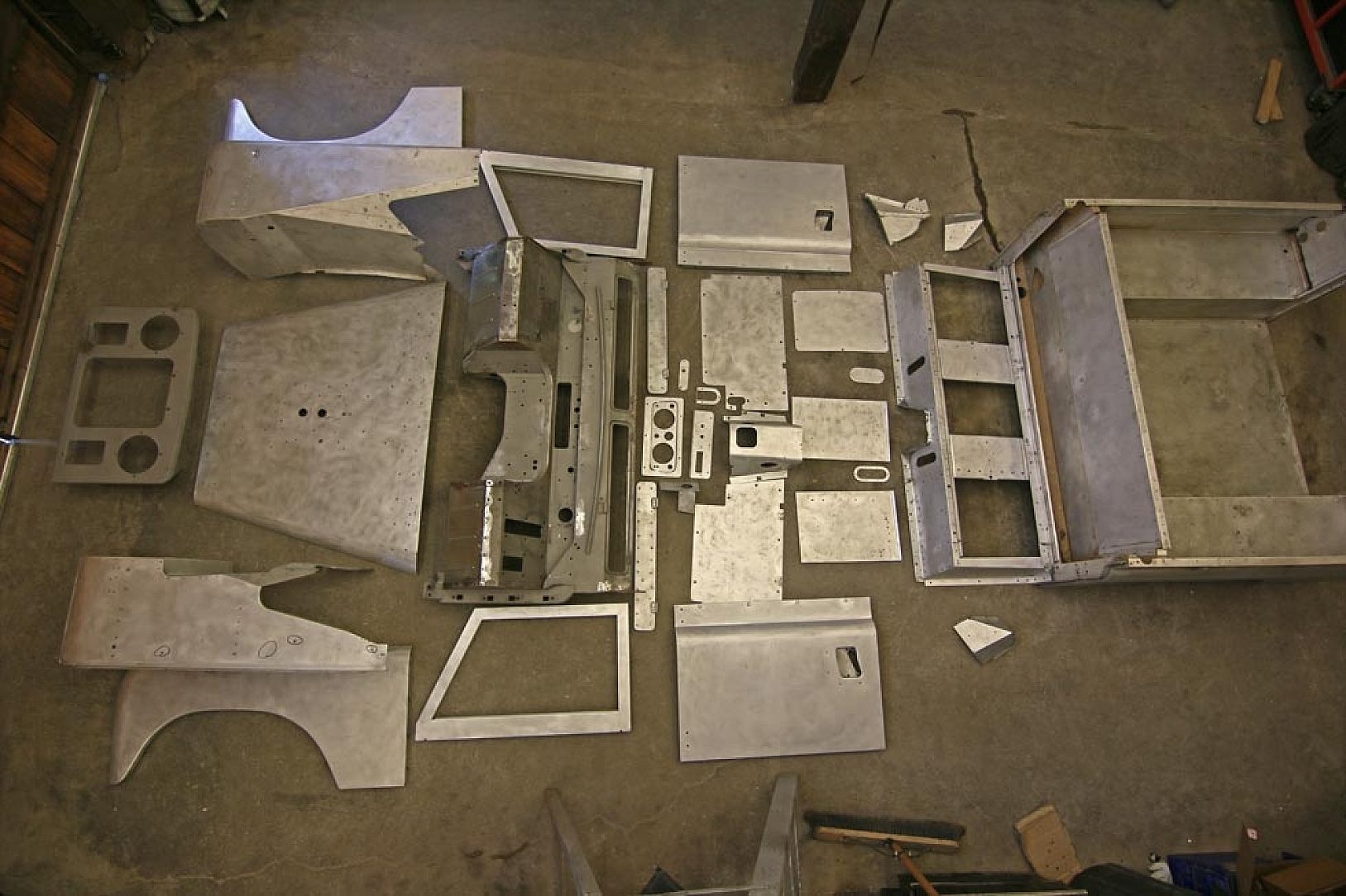 After disassembly, each panel was stripped from the previous galvanized steel back to bare steel and any dings were worked out. Any cracks in the steel or rotted holes were welded. Steel parts like the firewall, bumpers and the floor panels that were too rusty were cut out and new steel was welded to the original steel. After all the repairs, the parts were brought back and re-galvanized making the parts look brand new again.