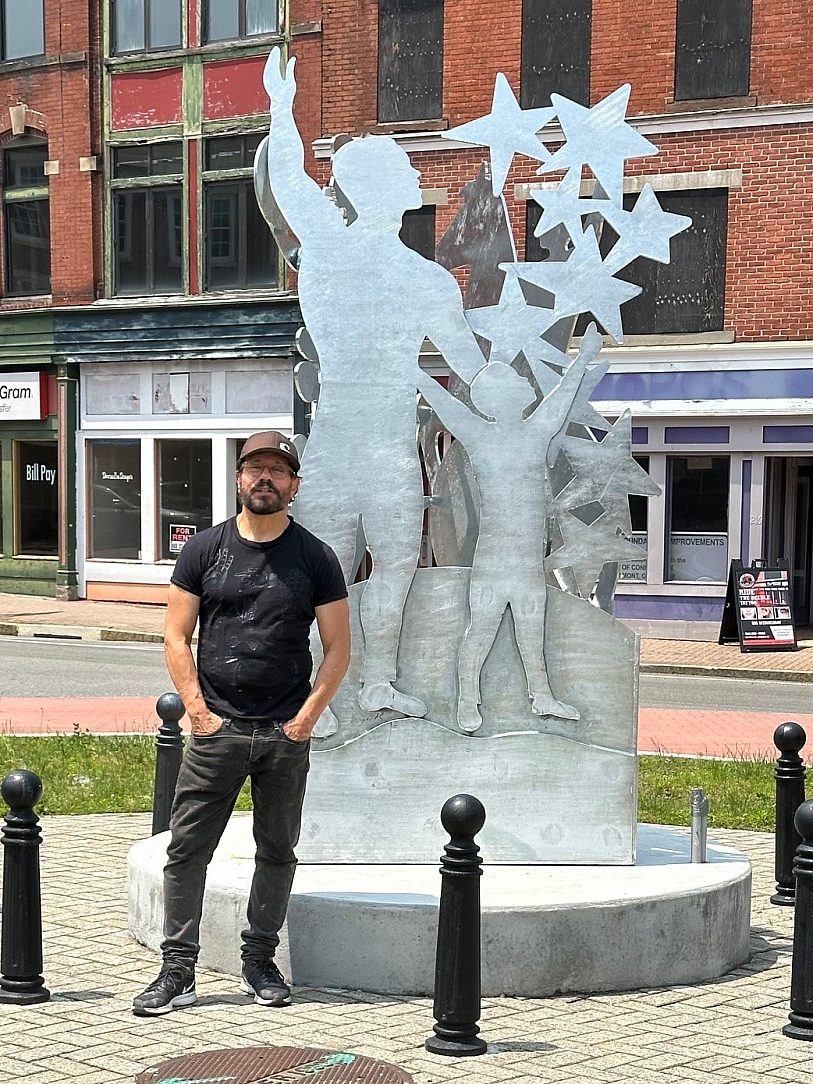 Crafted in galvanized steel, Promised Day stands at approximately 102” x 48” per panel and is made from approximately 2,207 pounds of structural steel. According to D Derek, while not a memorial, the sculpture serves as a contemporary reflection on the values that define the city—family, resilience, creativity, and care for one another and the natural world. The selection of galvanization was intentional. He informed us the best painted works only last 7 years optimistically whereas galvanization would be more resilient to time and ware with less upkeep and maintenance required. He also felt that creatively, the zinc finish would add a beautiful contrast to the square where it is displayed, standing vibrantly against the reds and browns of its surroundings.