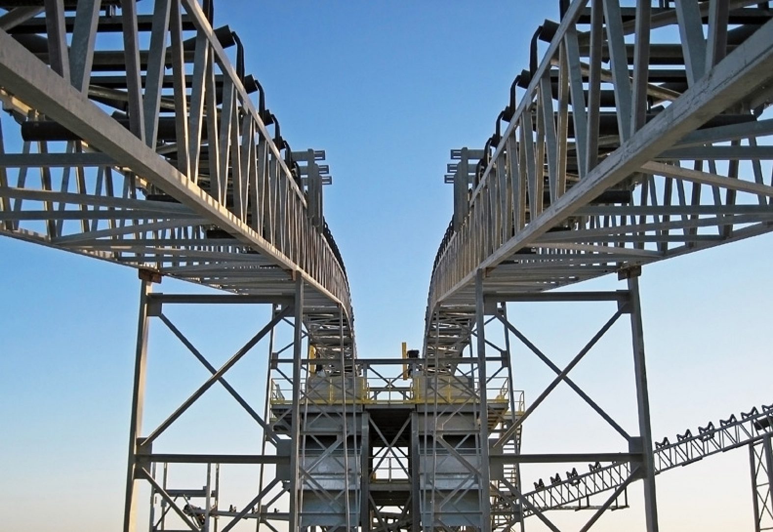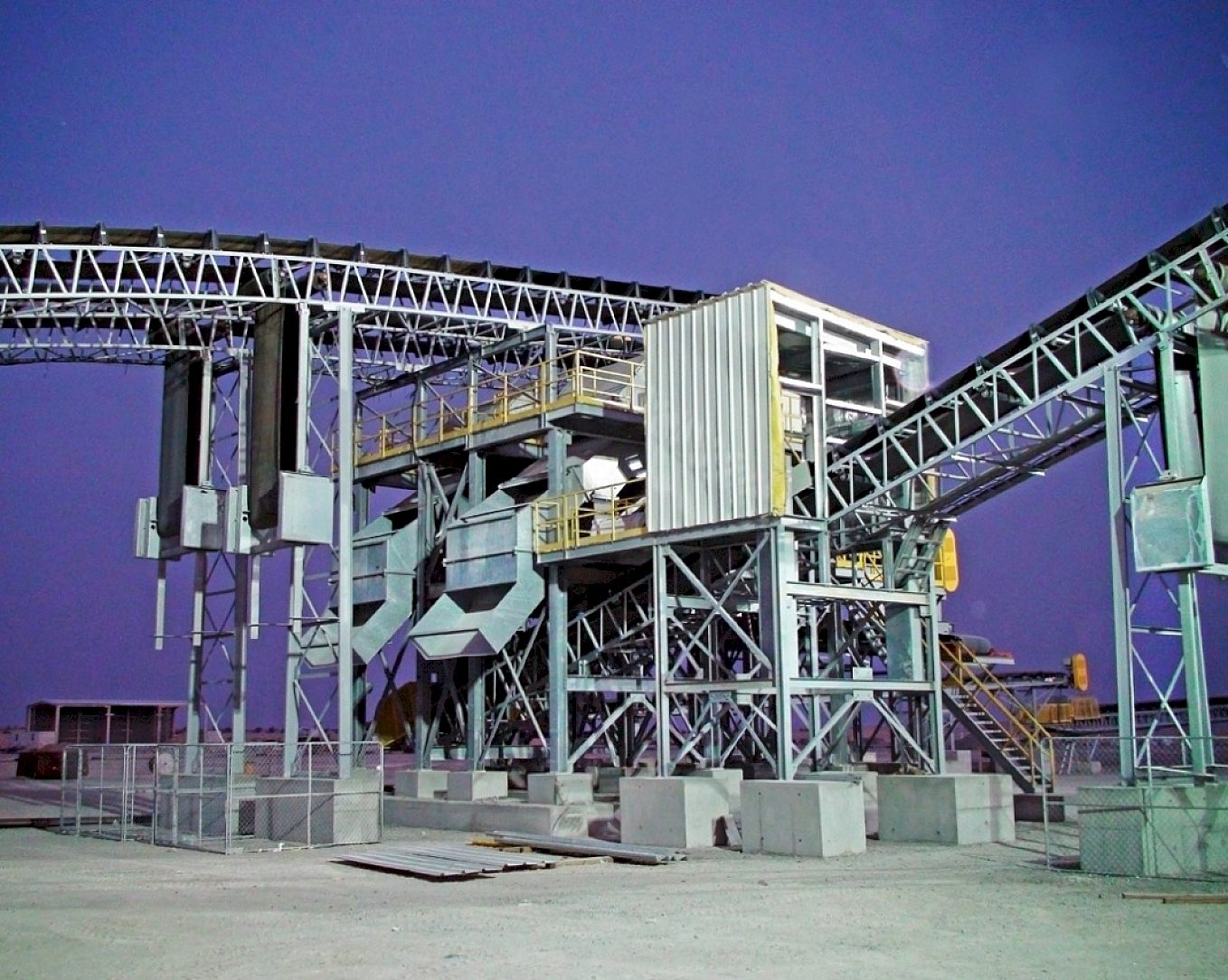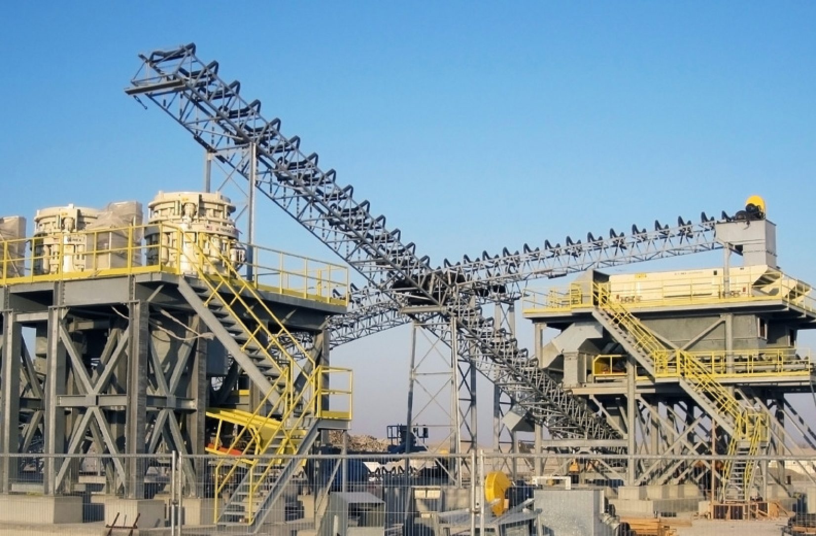 Structural steel, conveyor sections, hoppers, and stairways.