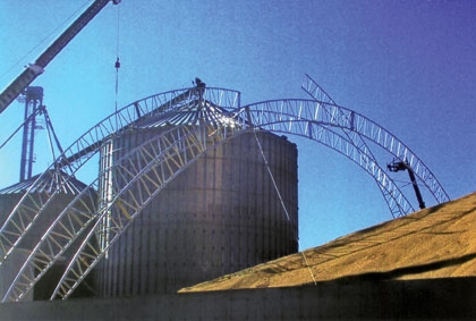 Creating a massive arched housing for grain storage, the Akron services project is a dynamic structure that creates substantial benefits for use in a wide variety of areas, including agriculture, industrial, commercial, and civic construction. Because it is critical for the tall structure to remain standing strong, unweakened by corrosion, hot-dip galvanized steel was specified for the more than 92,000 lbs of structural steel trusses and braces.