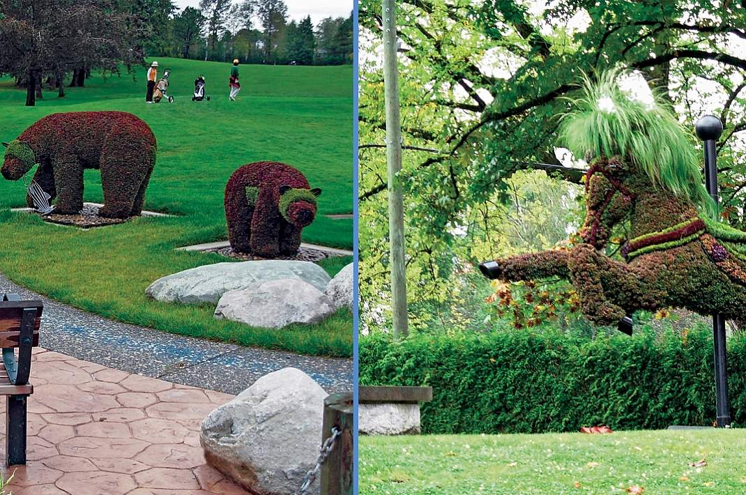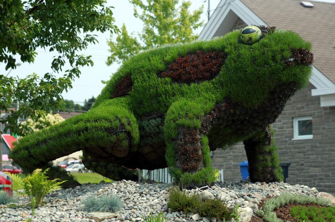 These eco-sculptures are built with a steel exoskeleton that creates the basic shape of the sculpture as well as providing the supports for the 110,000 flower pots that when grown provide the exterior appearance of the beautiful works of art. Thirty-eight different flower species create the mosaic of colors and textures that bring these sculptures to life.