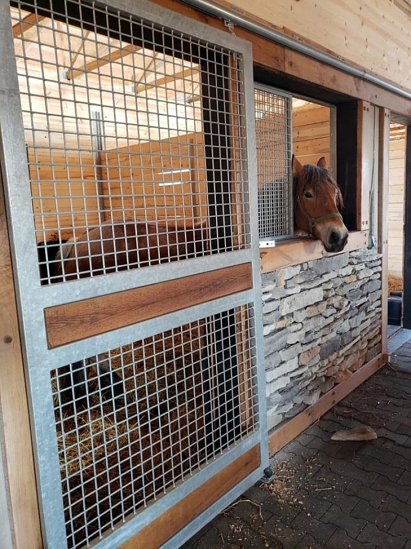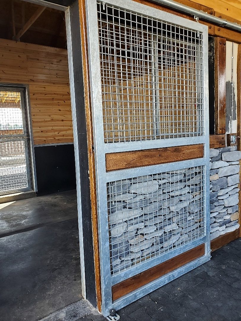 When pulling up to the barn you can see galvanized material throughout the farm. From each horse stall, stair case, fence panel, gate, the matte grey appearance pops with the stone façade. The dark oak enunciates the galvanized coating on the mesh panel fence surrounding the large barn and the exterior stair case. The stall doors allow for a free flow feel for the animal allowing for a hinged door to open in every stall. The durability of the coating will hold up well with the contact of a horse sticking its head through the open hatch. Throughout the barn a unique style of wood workmanship was used, peg and beam, displays the thought and workmanship that went into the farms aesthetic. The galvanized finish was used not only for the aestit of the rural environment to keep the rustic small town feel, but radiates class.