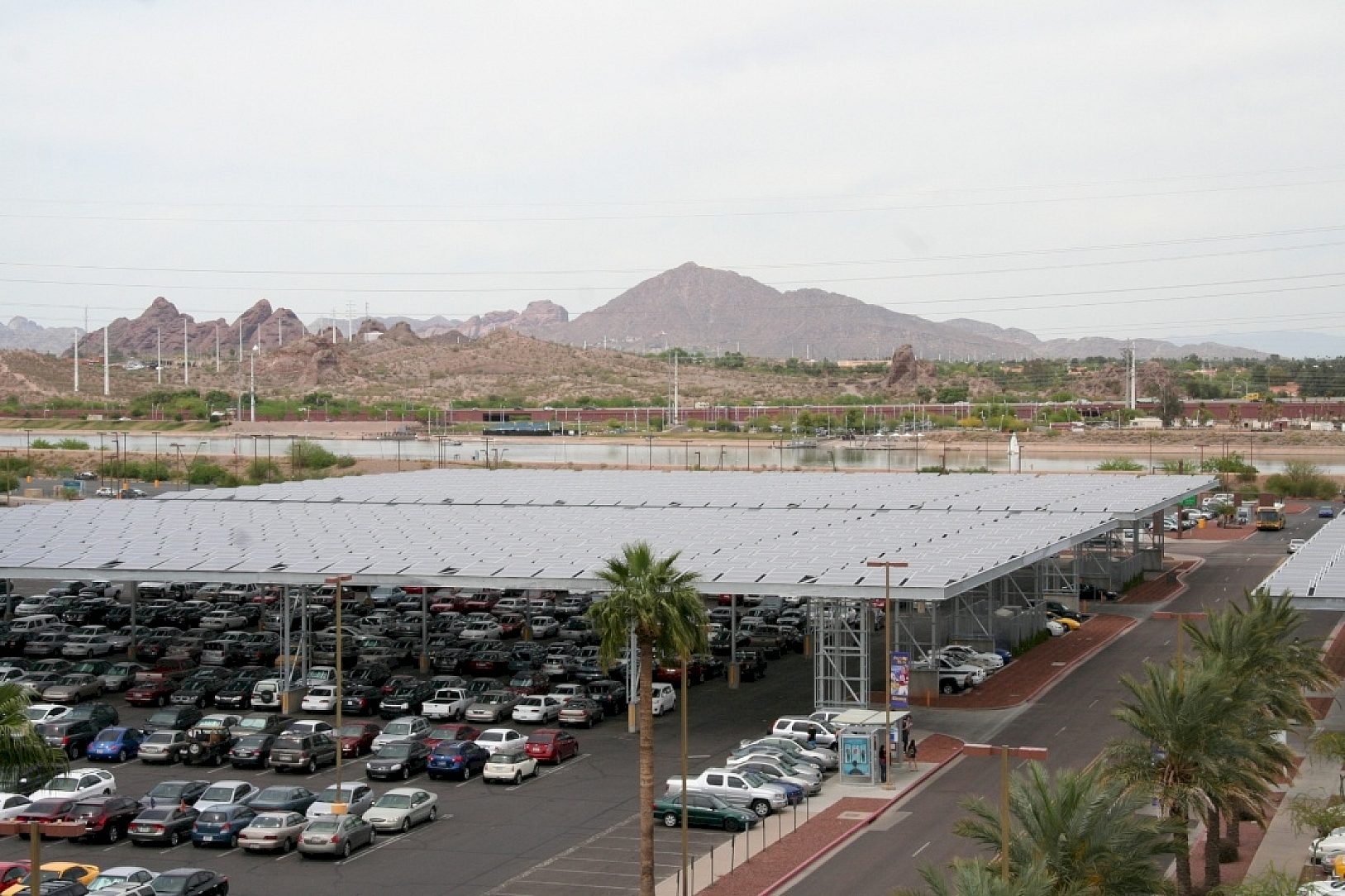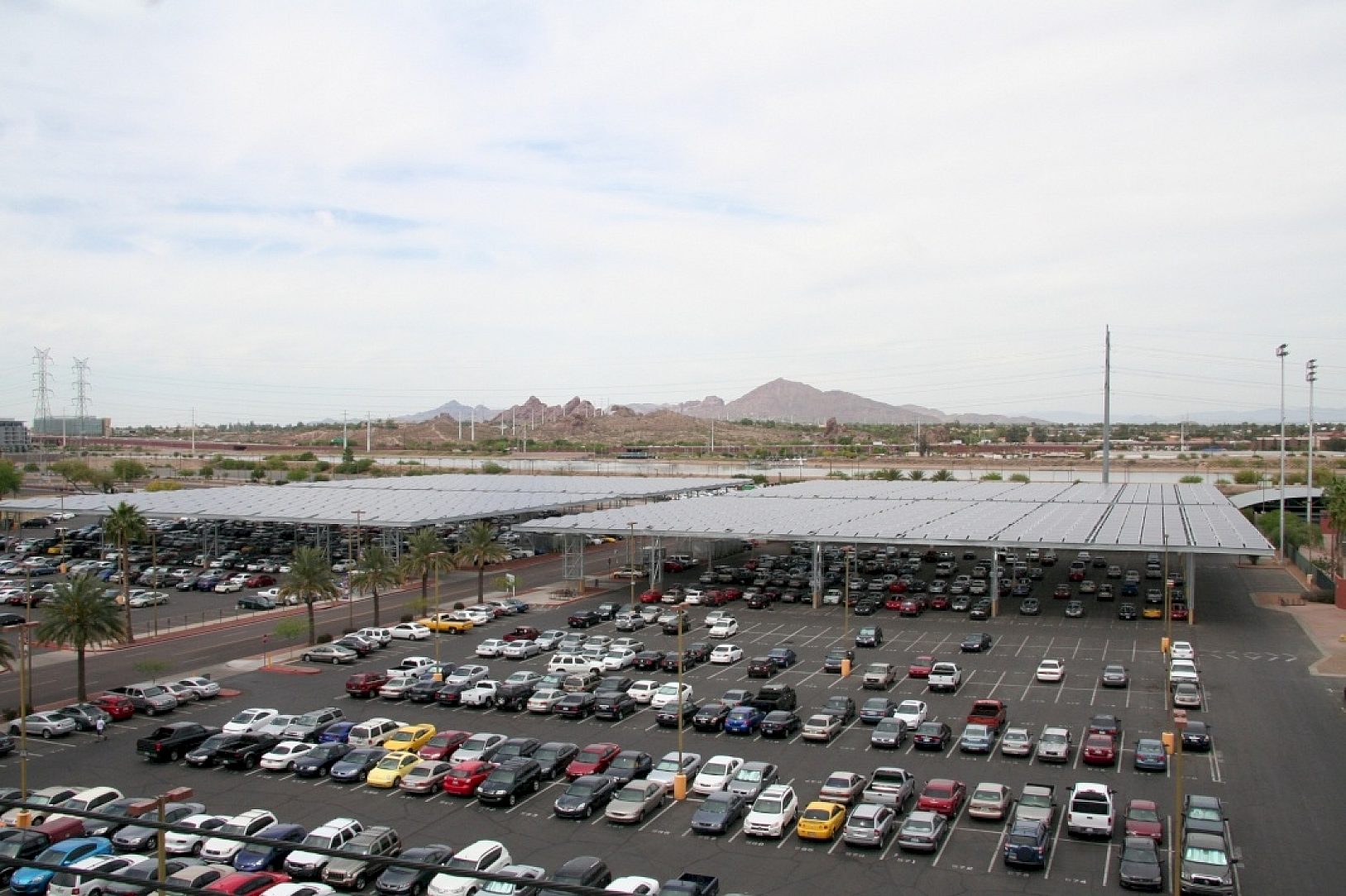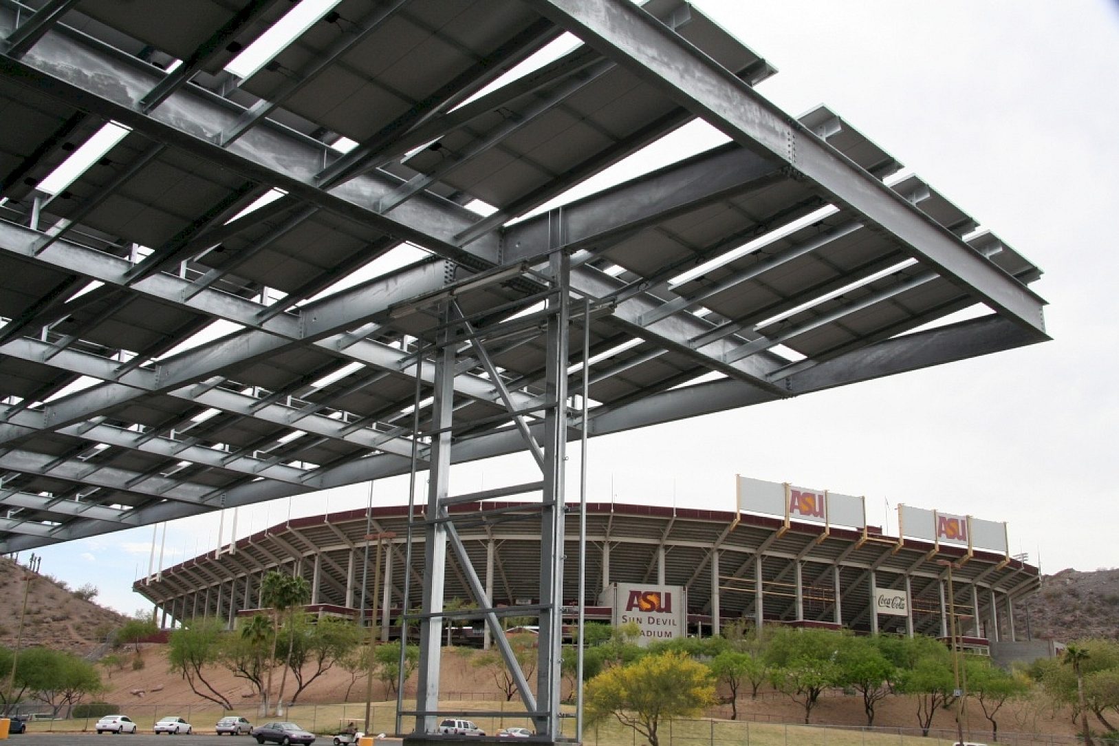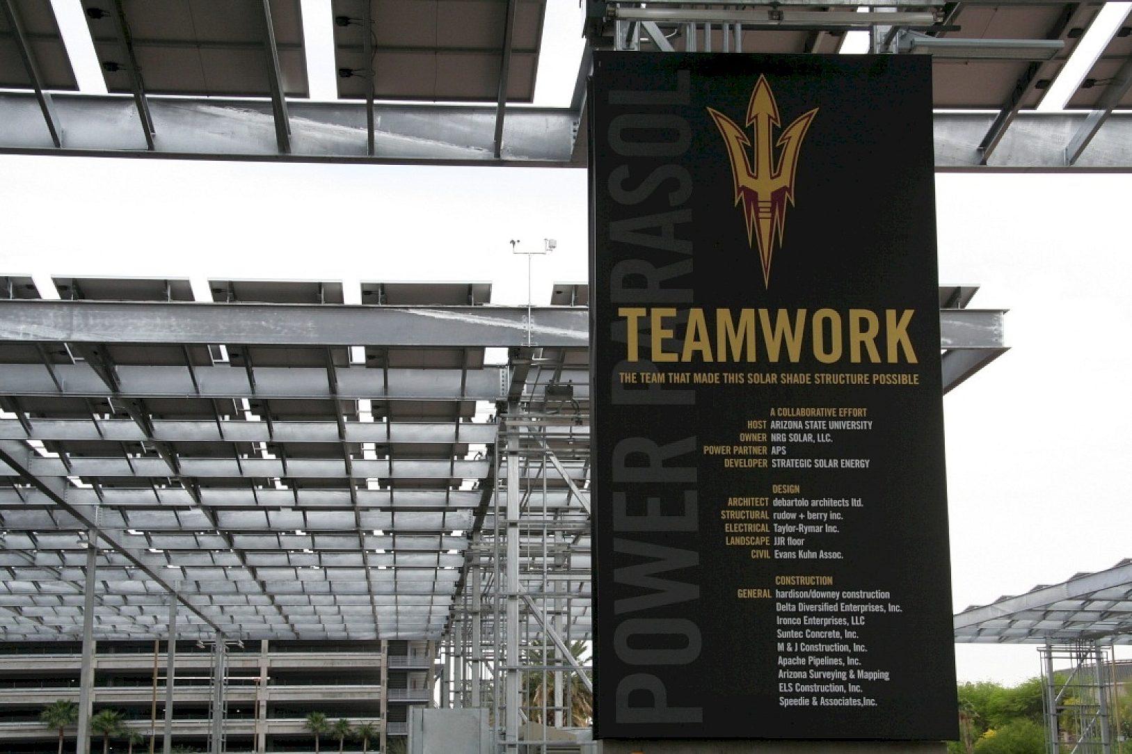 Today marks another important step in the universitys commitment to renewable energy, sustainability and entrepreneurial initiative. Arizona State University and Strategic Solar Energy took that step when they built the nations first PowerParasol solar canopy in the schools largest blacktop-surface parking lot. Lot 59 is situated adjacent to Sun Devil Stadium and is notoriously one of the most sweltering parking lots in the Phoenix area. The 5.25 acre lot boasts 6,000 parking spaces and certainly captured the attention of the ASU/NRG renewable energy committee. The committees goal was to design a project that was affordable, aesthetically pleasing, environmentally forward-thinking [that would] enhance the experience for visitors to the ASU campus.