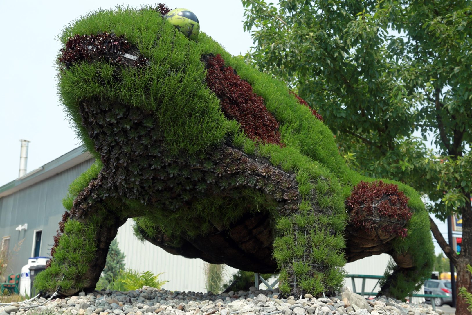 Just like in the natural habitat of a real frog, Mr. Vallee will continually wet thanks to constant integrated watering of his soil innards that keep the hundred of flowers that provide his color and texture healthy and bright. This of course would make quick work of his unprotected steel skeleton, and the complex three-dimensional shapes made complete paint coverage impossible. When this problem was brought to the attention of local steel fabricator Acier Trimax, he had a beautifully simple suggestion; hot-dip galvanizing, less expensive and better he insisted!