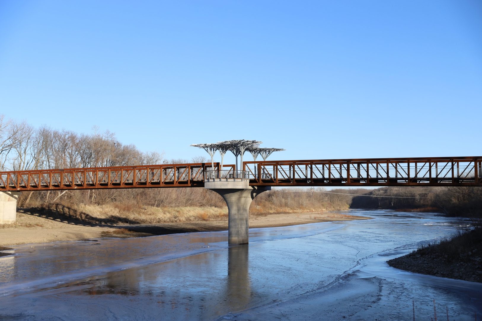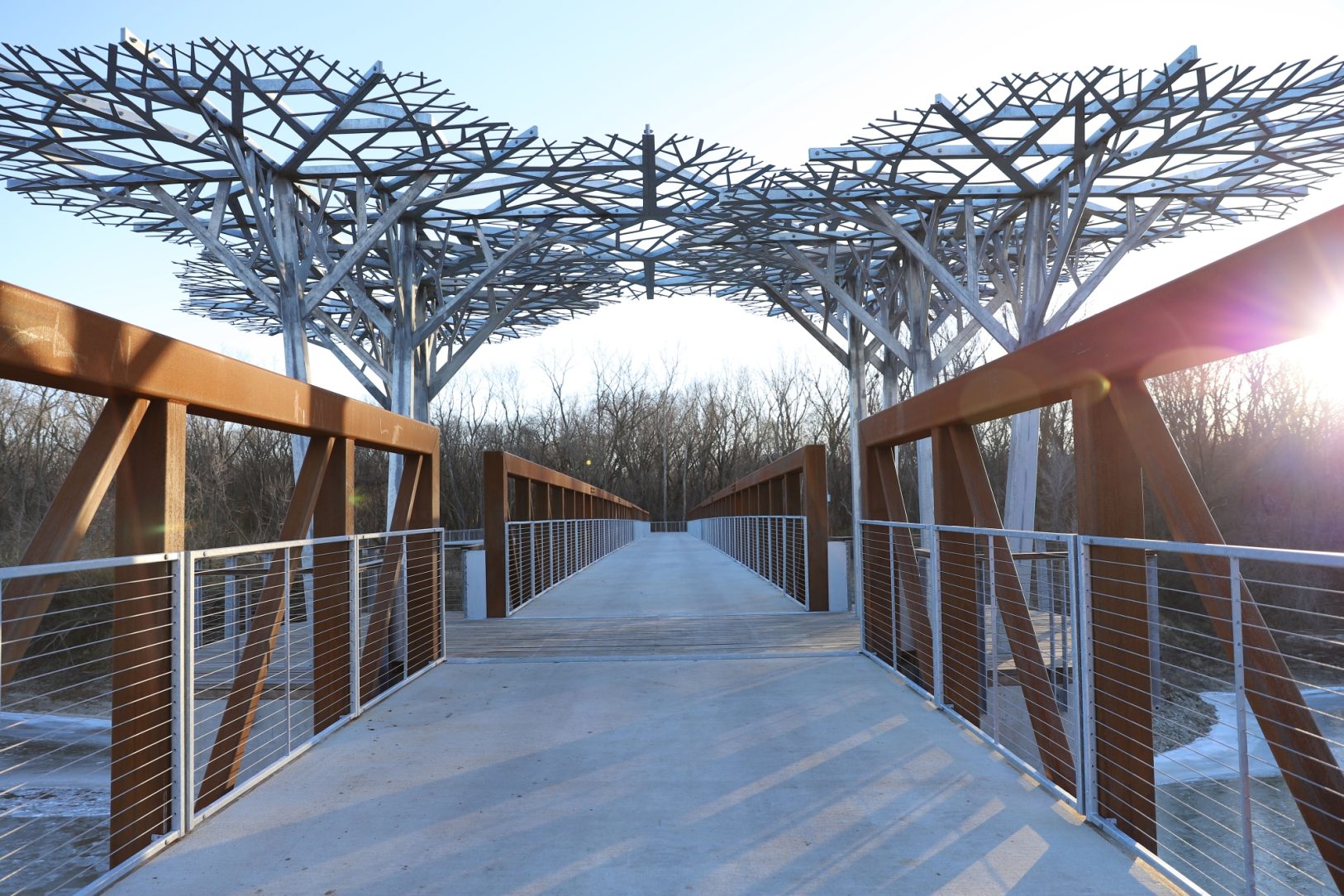 The bridge features the Raccoon River Plaza, with a 15-foot galvanized steel tree, a windblown leaf-patterned sign, and etched stainless-steel plaques recognizing over 300 donors. An elevated ramp on the south end gracefully descends through trees, leading visitors to the trail system, framed by steel railings and cables. The centerpiece of the bridge is a 16-foot-tall sculptural "tree canopy," crafted from galvanized steel to evoke woodland imagery while providing shade and inviting reflection amid panoramic river views.