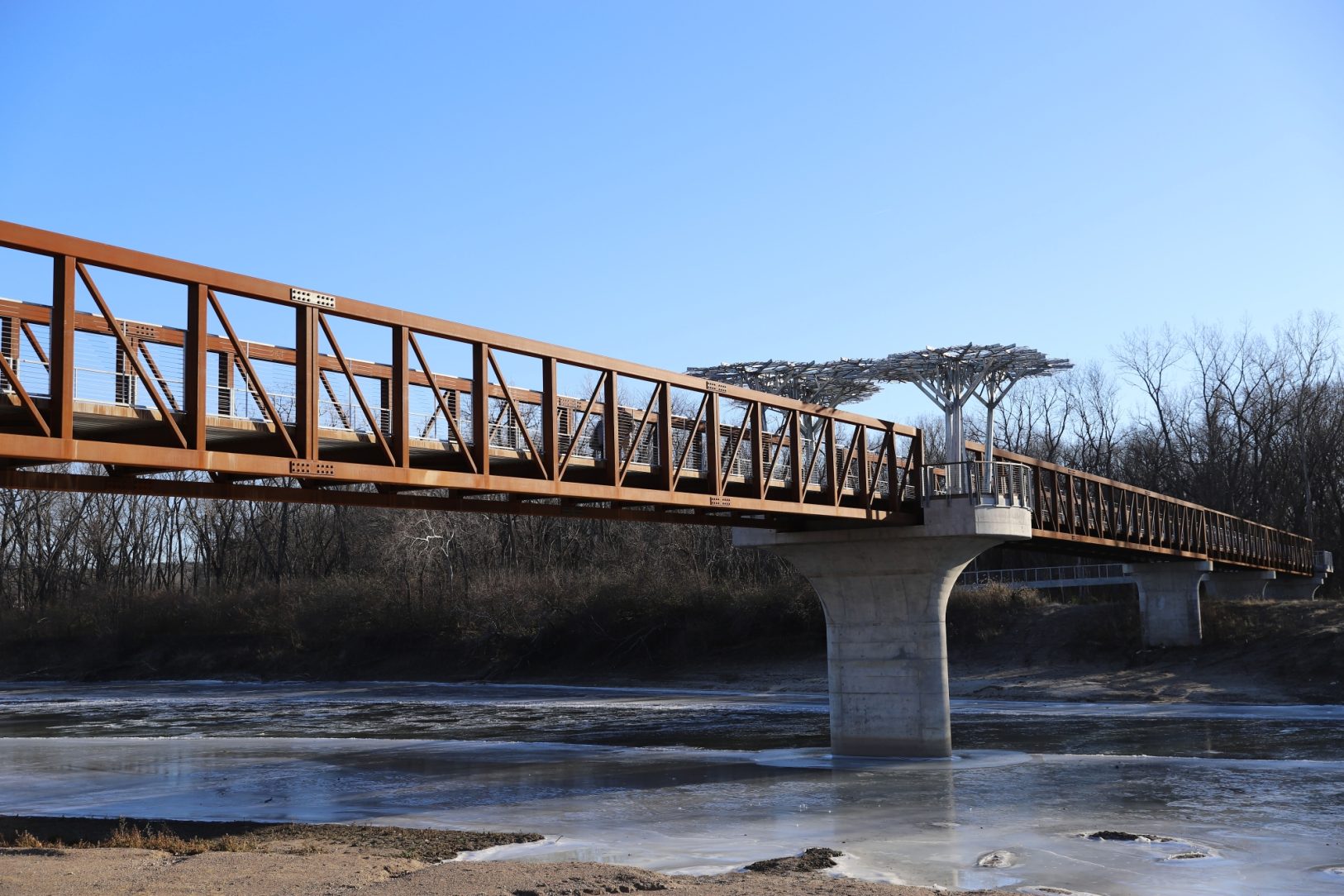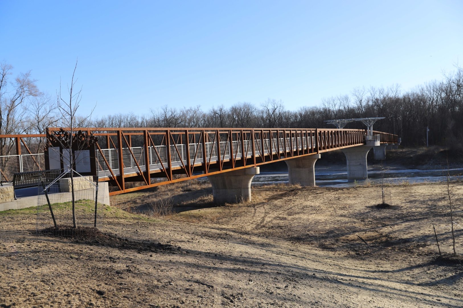 The $9.3 million project, including $2.8 million in donations, was the result of a collaborative effort between the City of West Des Moines Parks and Recreation, City Engineering, and the Shive-Hattery team of landscape architects, civil engineers, and graphic designers. The bridge was built to integrate with its environment, minimizing disruption to the mature trees and existing trails. A unique earth berm on the north end ensures easy access, while the elevated ramp on the south side was designed to minimize environmental impact while enhancing the visitor experience.