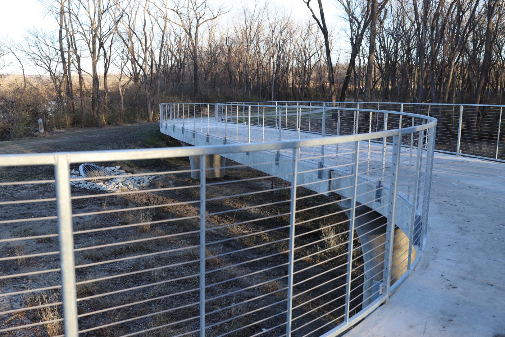 The project's goal extended beyond simply connecting pedestrians to both sides of the river — it sought to do so in a way that honors and preserves the natural beauty of the existing surroundings. Lined with mature trees, vegetation and existing trails in each park, the design team developed an earth berm on the north end to create an accessible trail and stair connection that welcomes pedestrians into the bridge from the City's most popular community parks. On the south side near Walnut Woods State Park, known for its mature woodlands and natural trails, an elevated, winding ramp was carefully designed to minimize environmental impact on the trees while creating a unique and immersive experience for visitors.