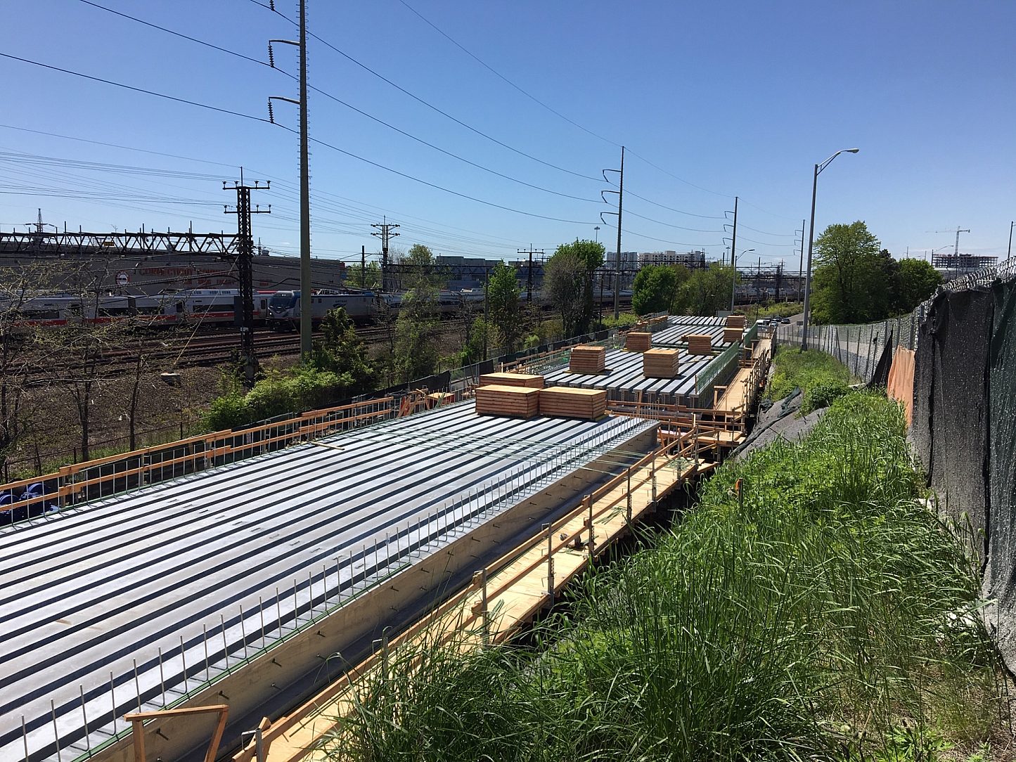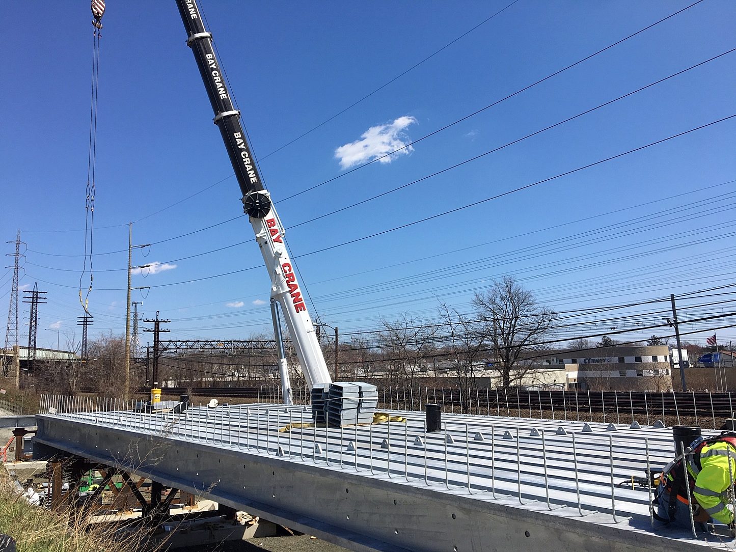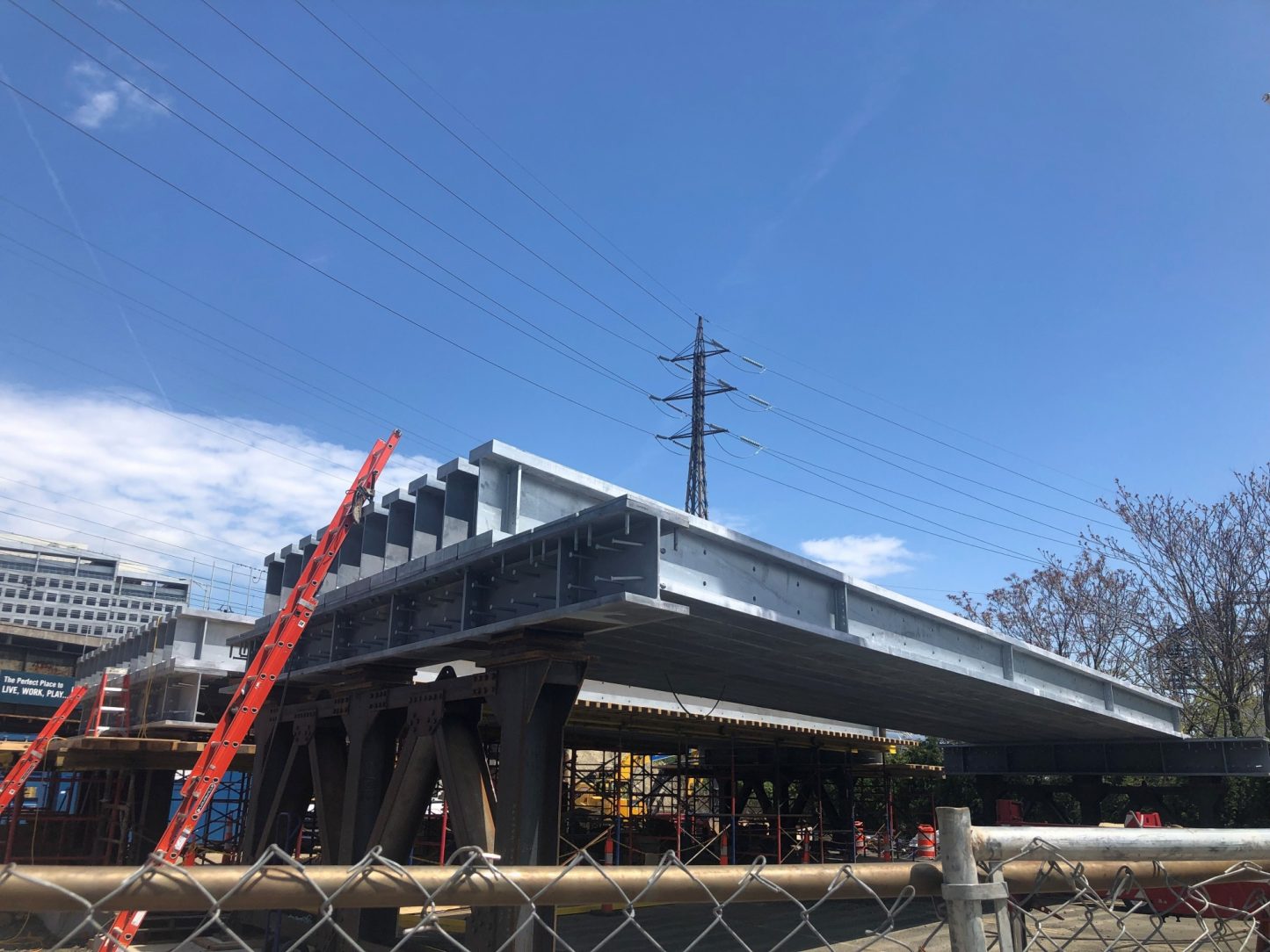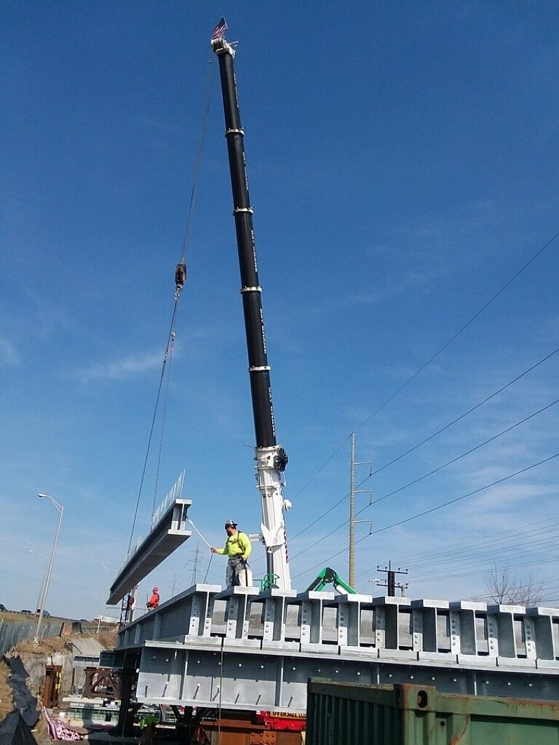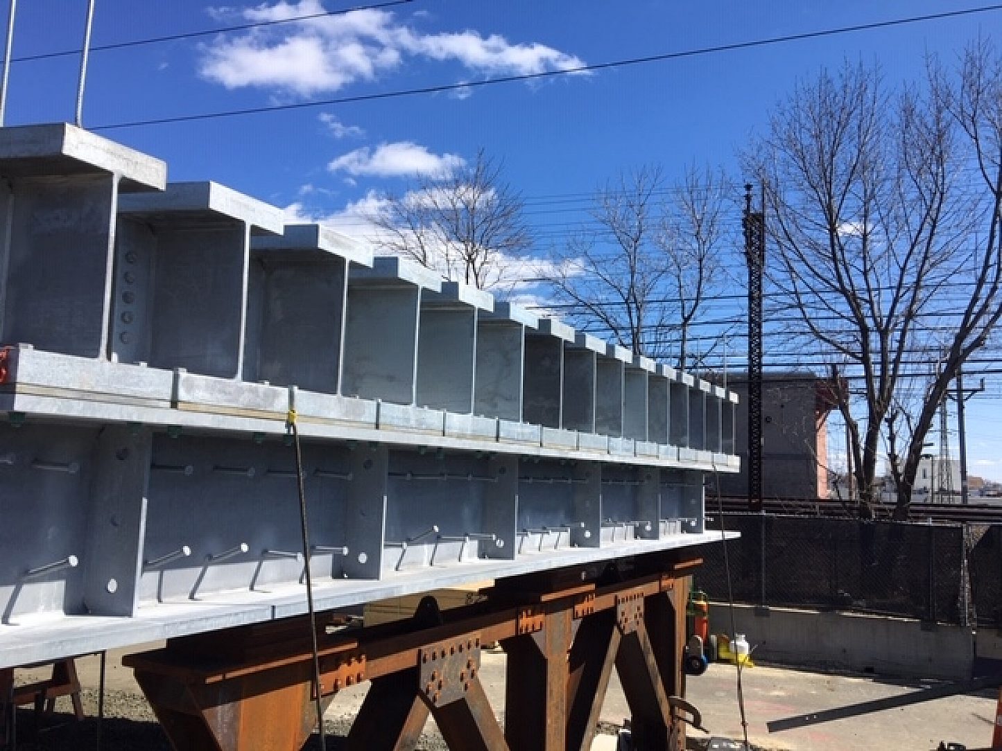 At the Elm Street site, temporary concrete foundations will accommodate the assembly of the bridge superstructure decks. The massive steel girders (88 total) weighing approximately 38,500 pounds each after galvanizing. The girders were originally specified to be metallized, as the owner was not aware that girders of this size and weight were able to be hot-dip galvanized. The change over to galvanizing allowed the project to be completed faster and at a lower budget than originally planned.