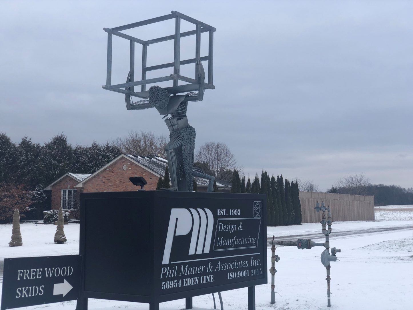 Atlas Man welcomes customers and other visitors while carrying the weight of the world on his hot-dip galvanized shoulders.