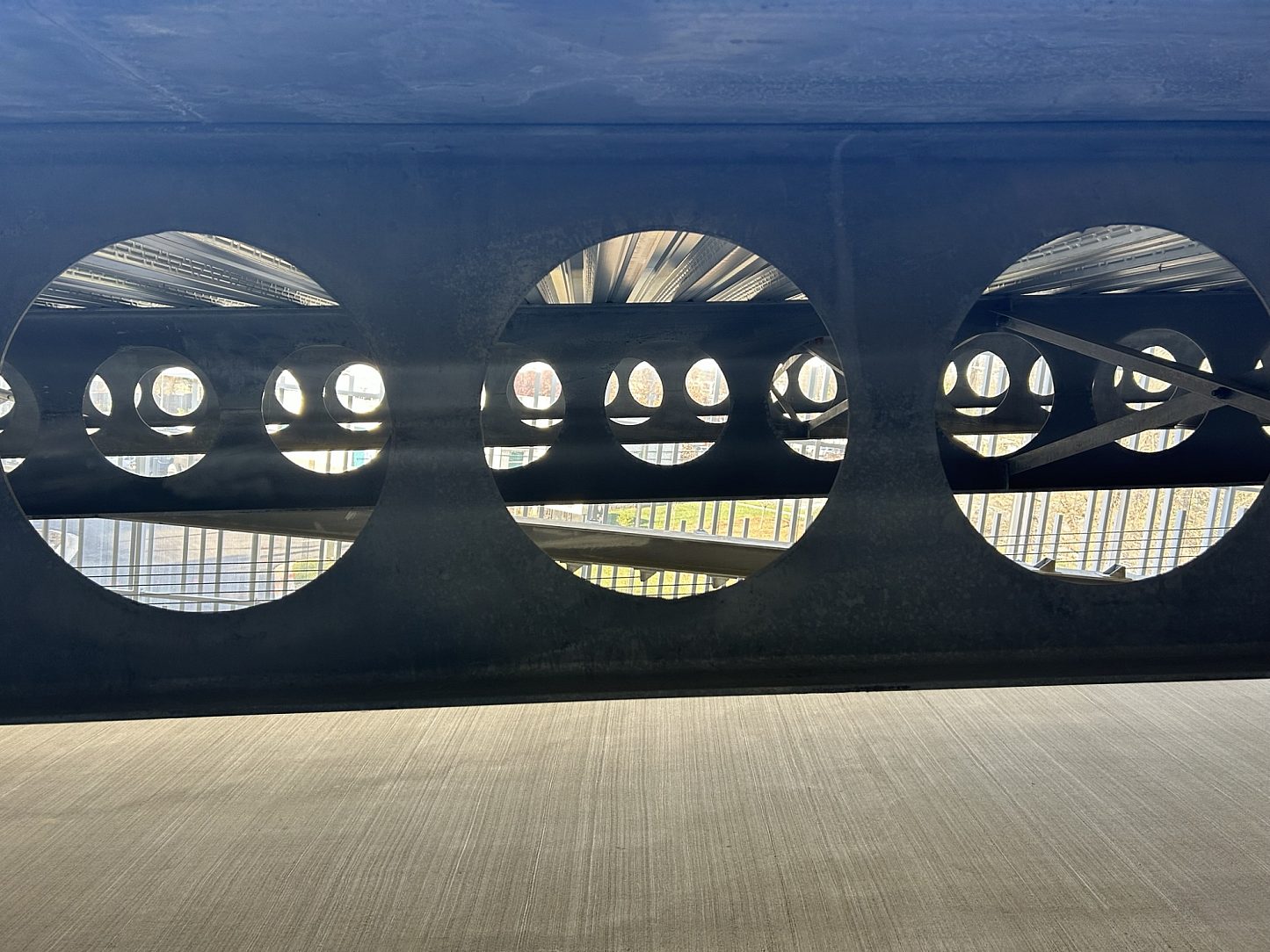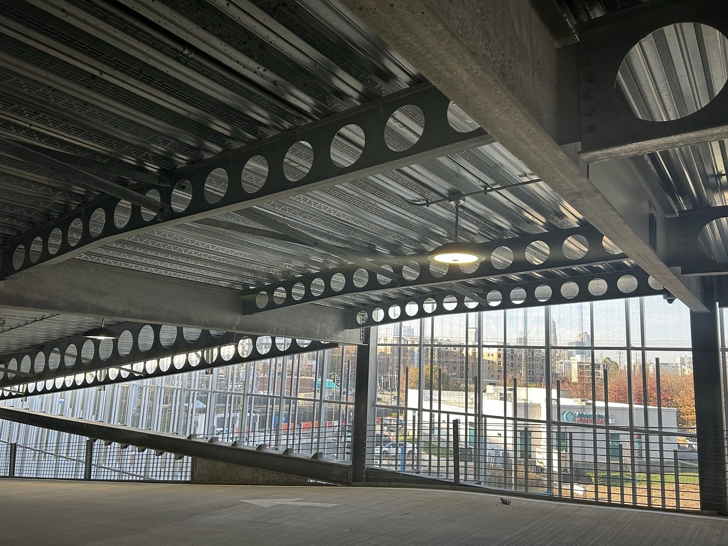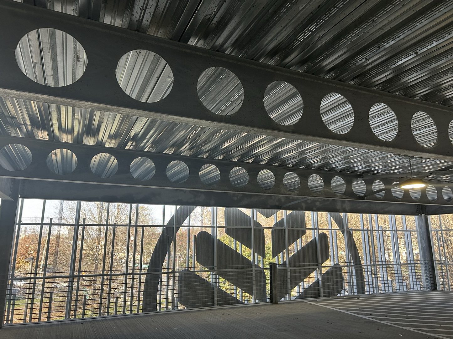 One of the major supporting longitudinal design elements of this project was a special proprietary C Beam. C Beams, also known as cellular beams, are created by cutting a normal structural steel beam down the middle, using both a straight line and a semi-circular pattern. The beam is then separated and offset, then welded back together. This offset welding creates a circular pattern throughout the middle of the beam, and results in a taller, deeper beam than the original steel beam it was cut from. The steel voids that create project savings are made when the larger depth of the C Beam is used in lieu of designing from the same depth of a normal solid steel beam. Over 44 loads of C Beams were designed for this project to create a large savings in steel costs for the project.