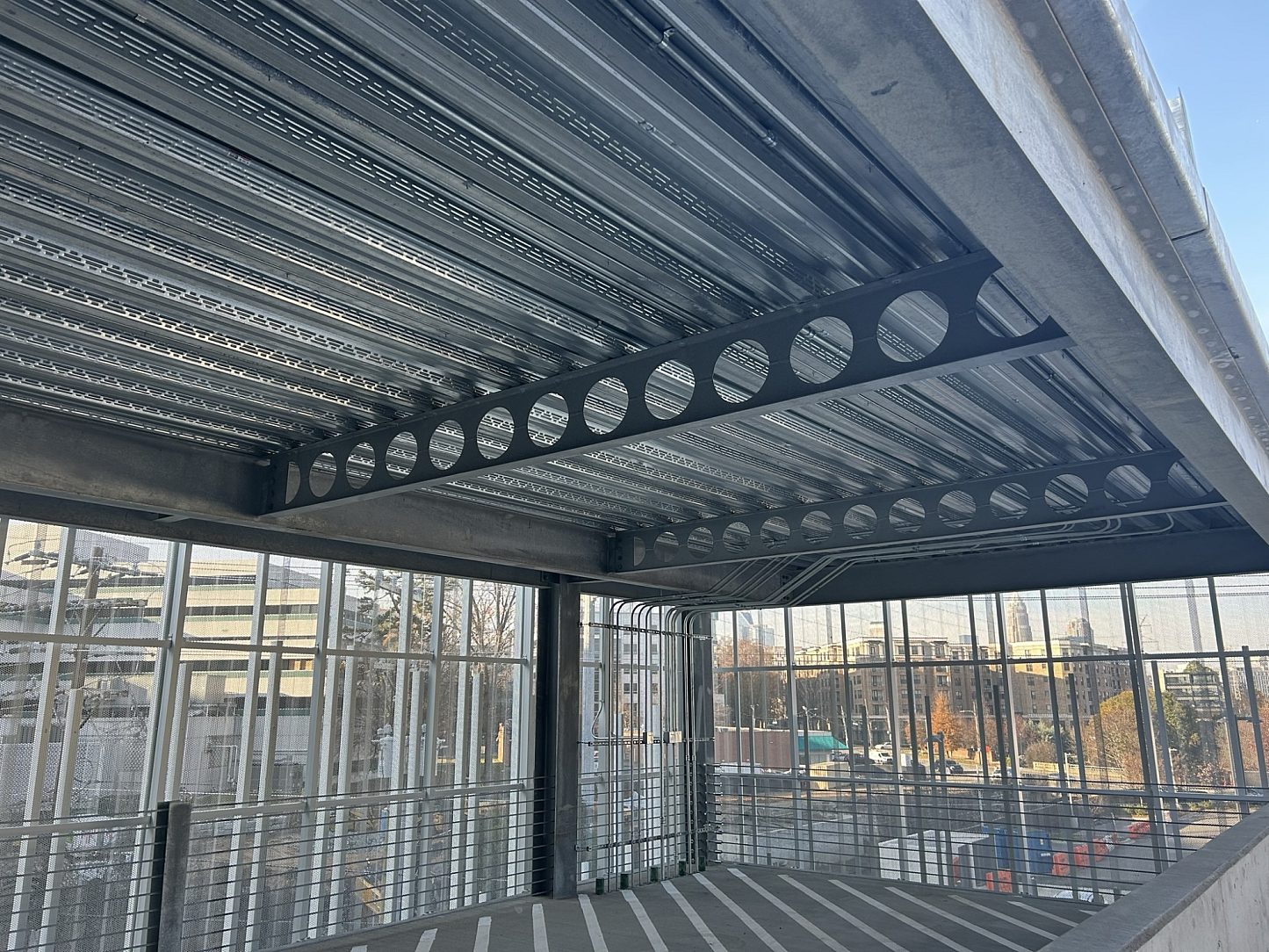 All structural steel elements in the parking structure. Cellular Beams, columns, supporting structural horizontal steel, clips, fasteners, and welded angles.