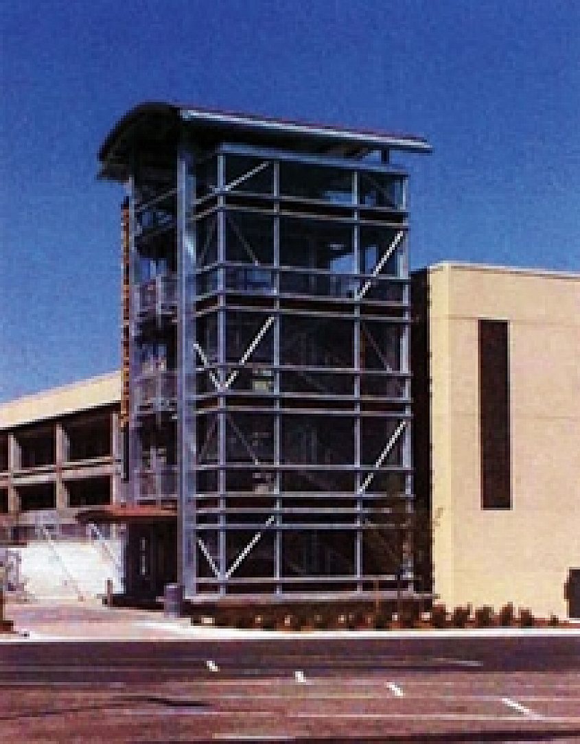 Galvanized steel was used in this parking garage on the external stair tower. HDG steel was specified for its durability and pleasing appearance. Because the stair tower was built onto the outside of the parking structure, it was completely exposed to the environment. Galvanized steel was best suited to withstand the exposure to the environmental elements while offering an aesthetically pleasing appearance. The uniform coating of the metallic finish also allowed patrons an outdoor view from the glass elevators.