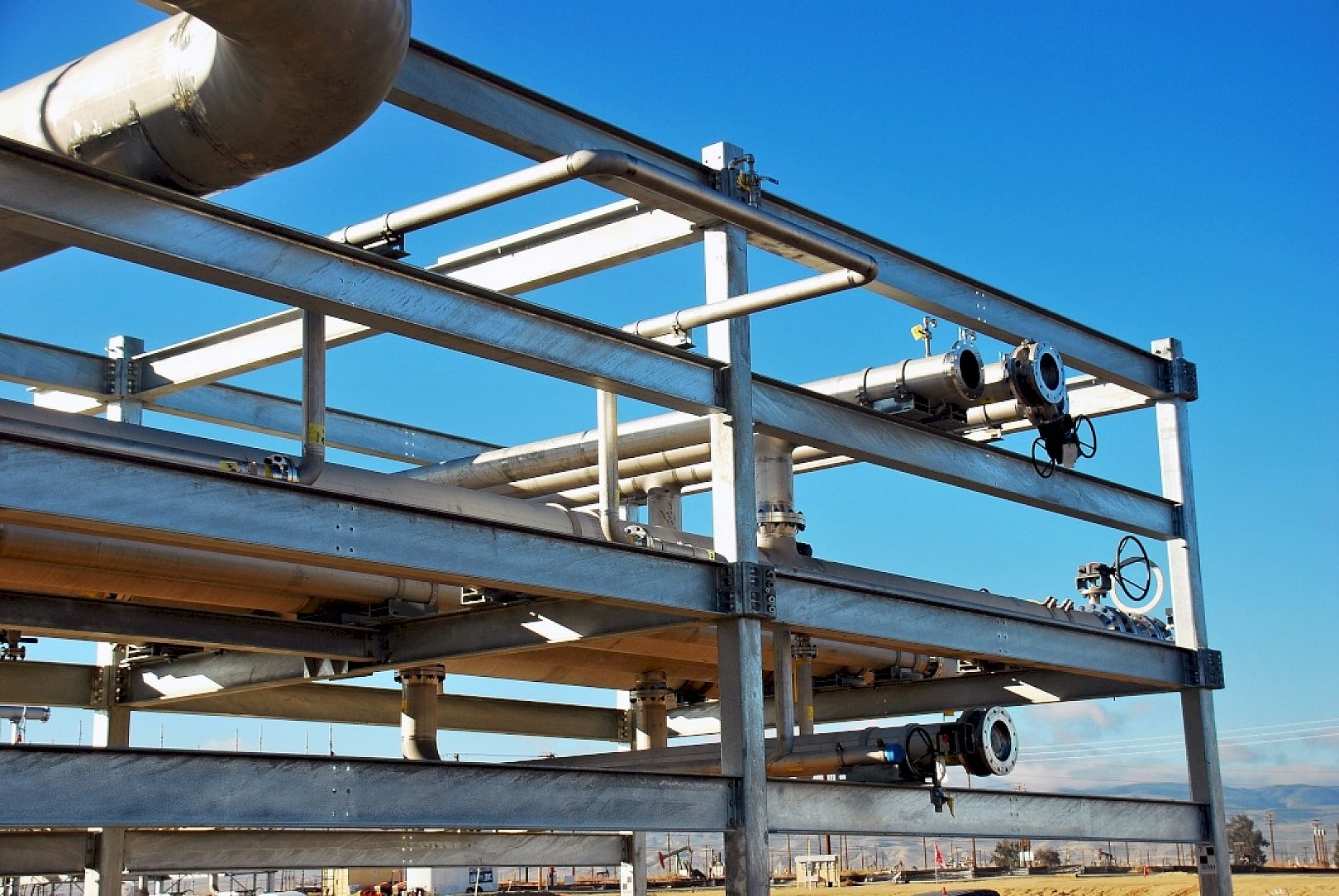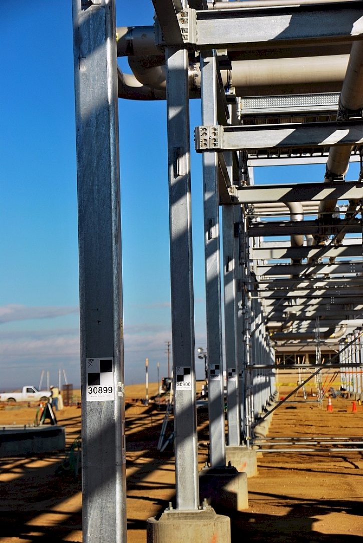 The new Belridge, CA, water softening treatment plant (located northwest of Bakersfield, CA) was designed using the latest technologies and constructed using an advanced 3D modular approach. The main foundational pipe rack is a proprietary design using an interlocking (machined forged) inner collar tube column that is easily assembled/disassembled to allow the entire facility to be transported (when required) to different geographical locations out in the field. It is being specifically developed to aid and eventually replace the existing treatment plant which has reached maximum capacity. Water softening treatment plants are important because water produced out in the field generally contains high concentrations of total dissolved solids (hardness) which must be significantly reduced (softened) in order to be used for multiple purposes such as boiler feed water, steam generator feed water or even simply injection to displace oil from the production wells.