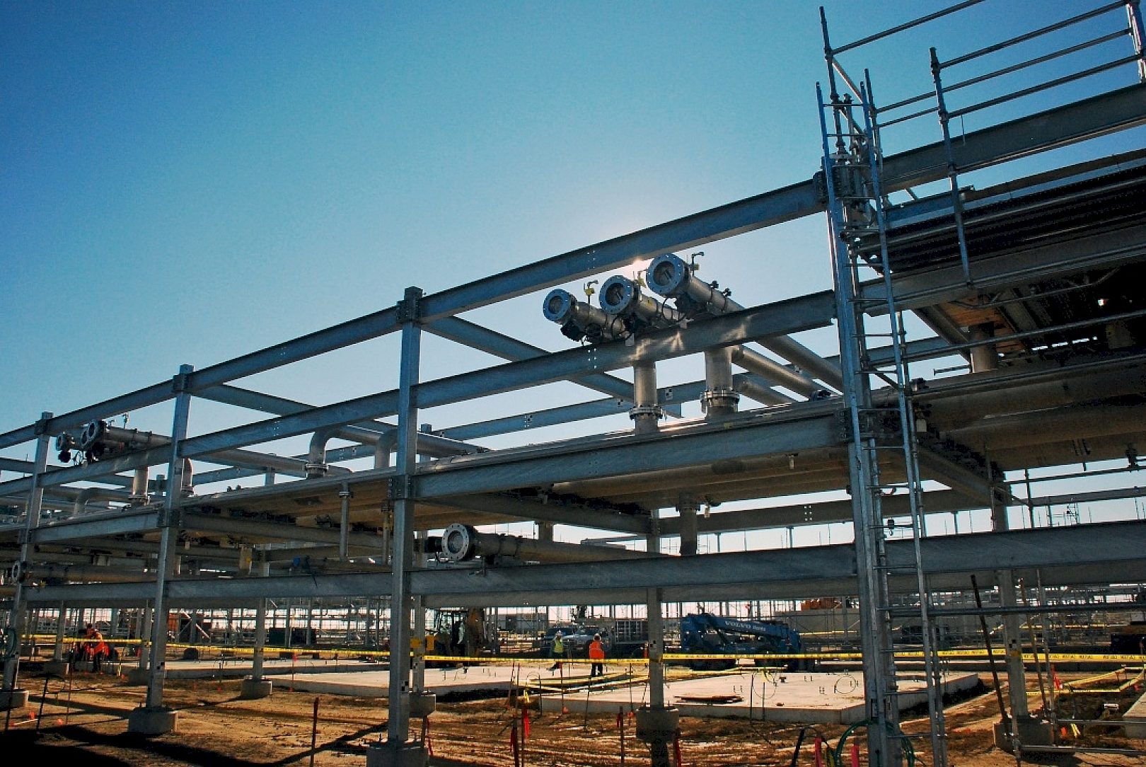 This project involved detailed planning and scheduling along every step of the hot-dip galvanizing process. The manufacturer issued a strict mandate that all threaded holes on the tube columns were to be kept perfectly clean, and in following this mandate the galvanizer plugged every single threaded hole with a steel bolt. After the tube columns were hot-dip galvanized, the steel bolts were each manually removed, wire brushed and meticulously inspected for debris. Extensive clean-up on the material was also required so that the precision tolerances of the forged inner collar connections were all kept within tight specification.
