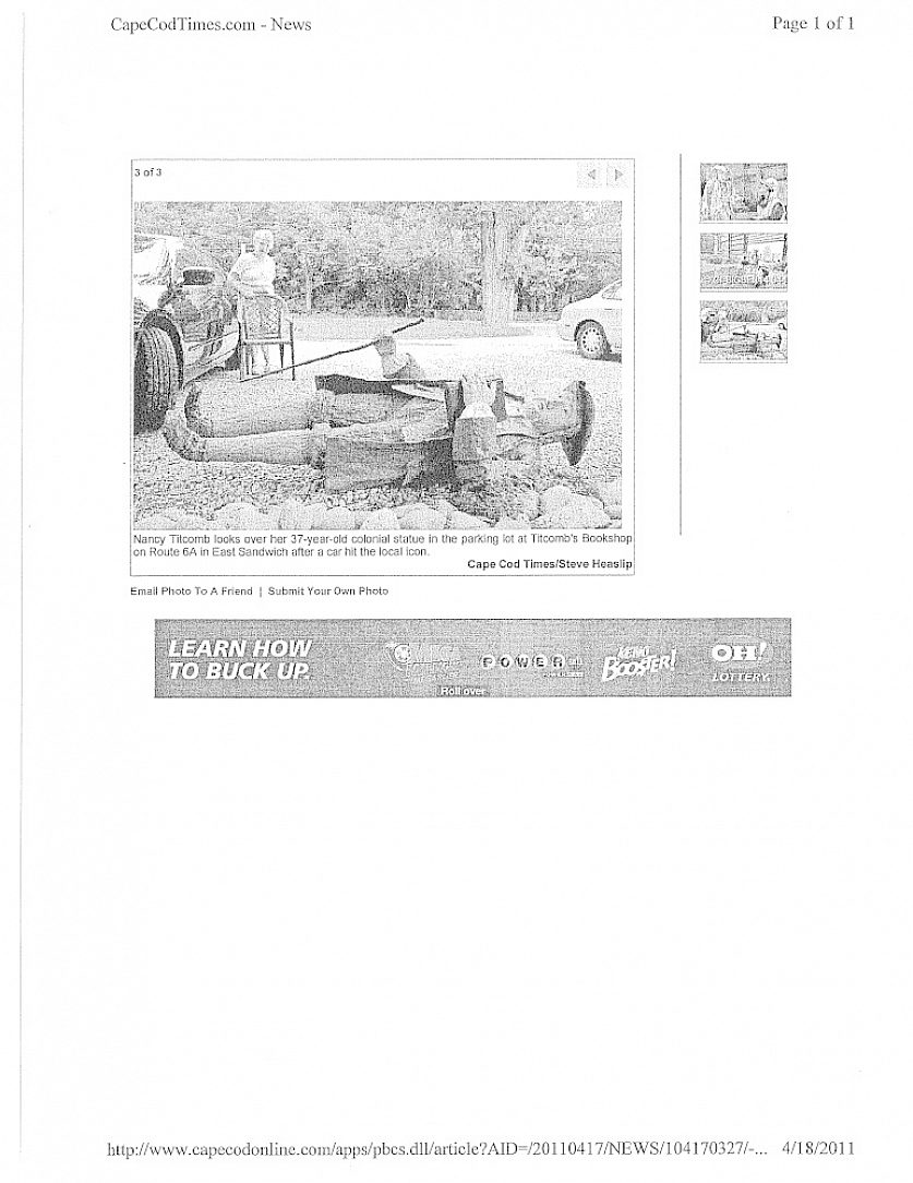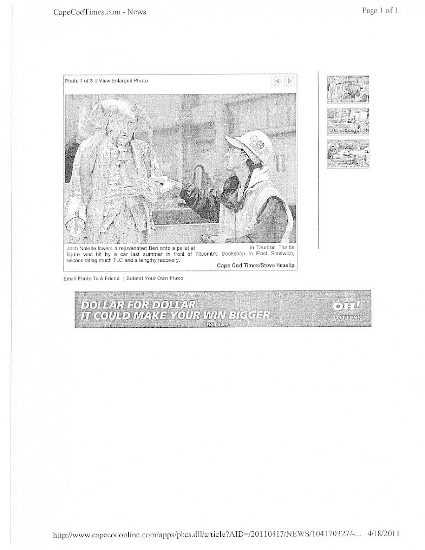 The likeness of the historic feature of Benjamin Franklin has been in front of this bookstore for many decades. This past Spring it was hit by a car, broken in half, and left laying by the side of the road rusting and deteriorating.
