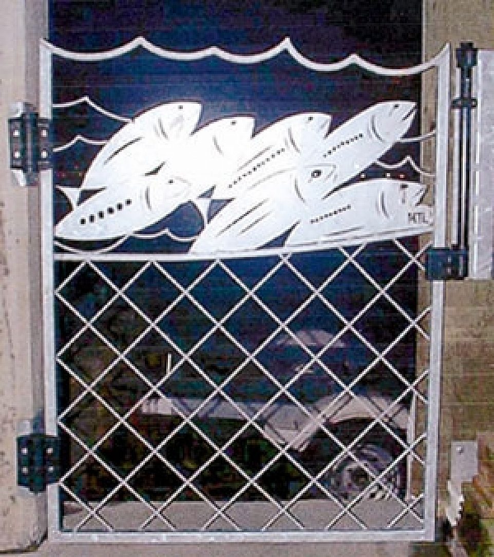 The artist/owner's keen eye recognized the aesthetic quality that hot-dip galvanizing delivered to these gates, located at his home on Tiki Island in the Gulf of Mexico. Both pieces capture special moments of past fishing adventures where the silver marlin and waters of the gulf are in harmony, as seen from the back of the artist's boat.