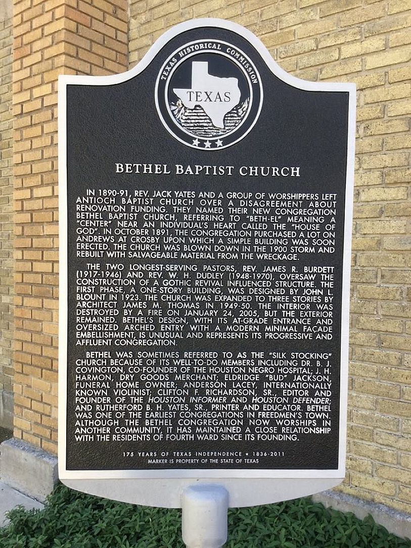 The Bethel Church is located in the 4th ward of Houston Texas. It was founded as an African American place of worship by Rev. John Yates in the late 1800s. The first building structure was destroyed by the massive hurricane in 1900. After being rebuilt the building was once again hit with tragedy in 1920 by a fire, causing a complete loss. In 1923 the church was erected for a third time and stood the test of time until 2005 when another fire destroyed the interior of the church. At this time the city of Houston purchased the property with intention of making it a historic site and memorial.