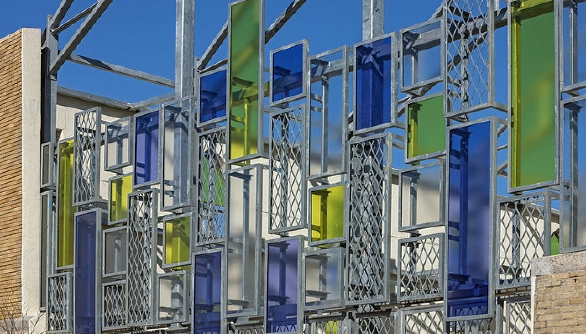 All structural steel, frame supports, and decorative windows.