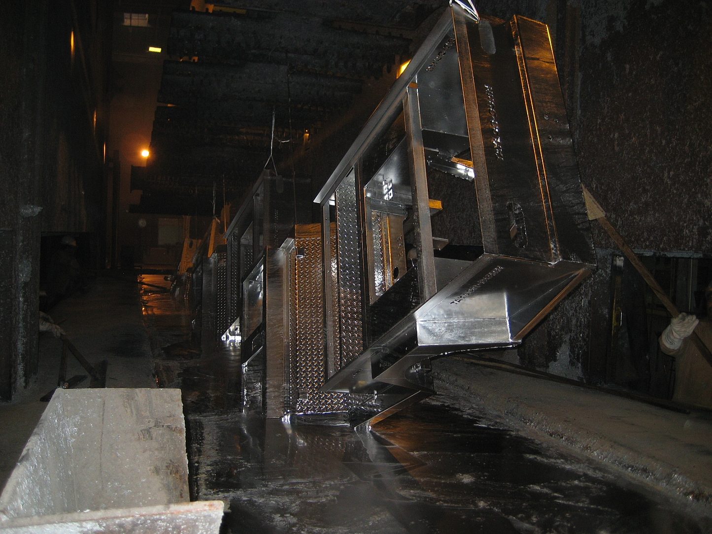 The hot-dip galvanizing of the utility cart frames can be a bit tricky because it requires hanging them at specific angles to help with not only the initial submersion of the material into the molten zinc but also for proper drainage when removing it from the molten zinc.