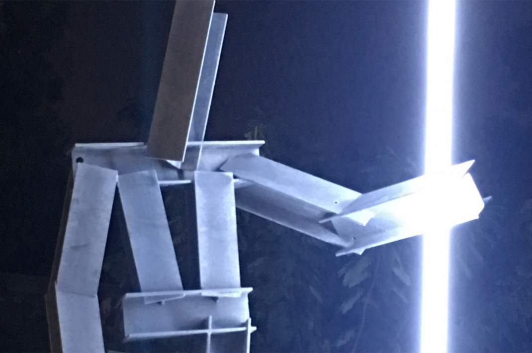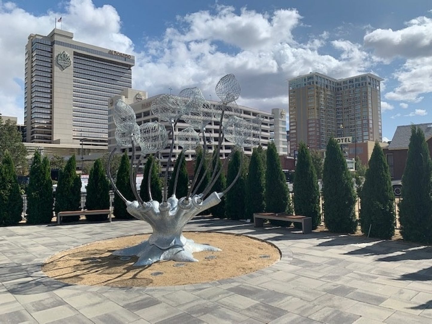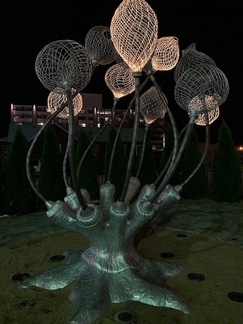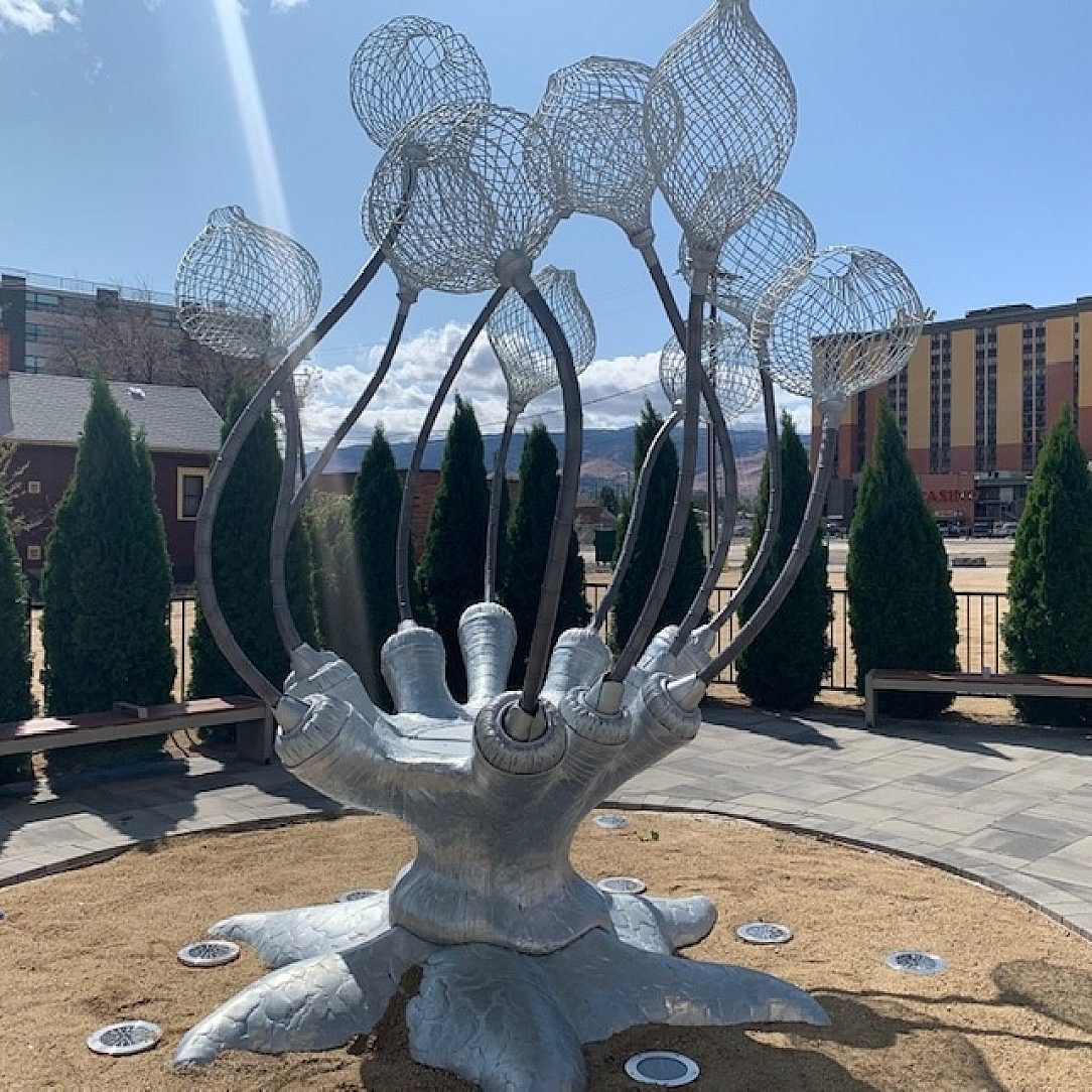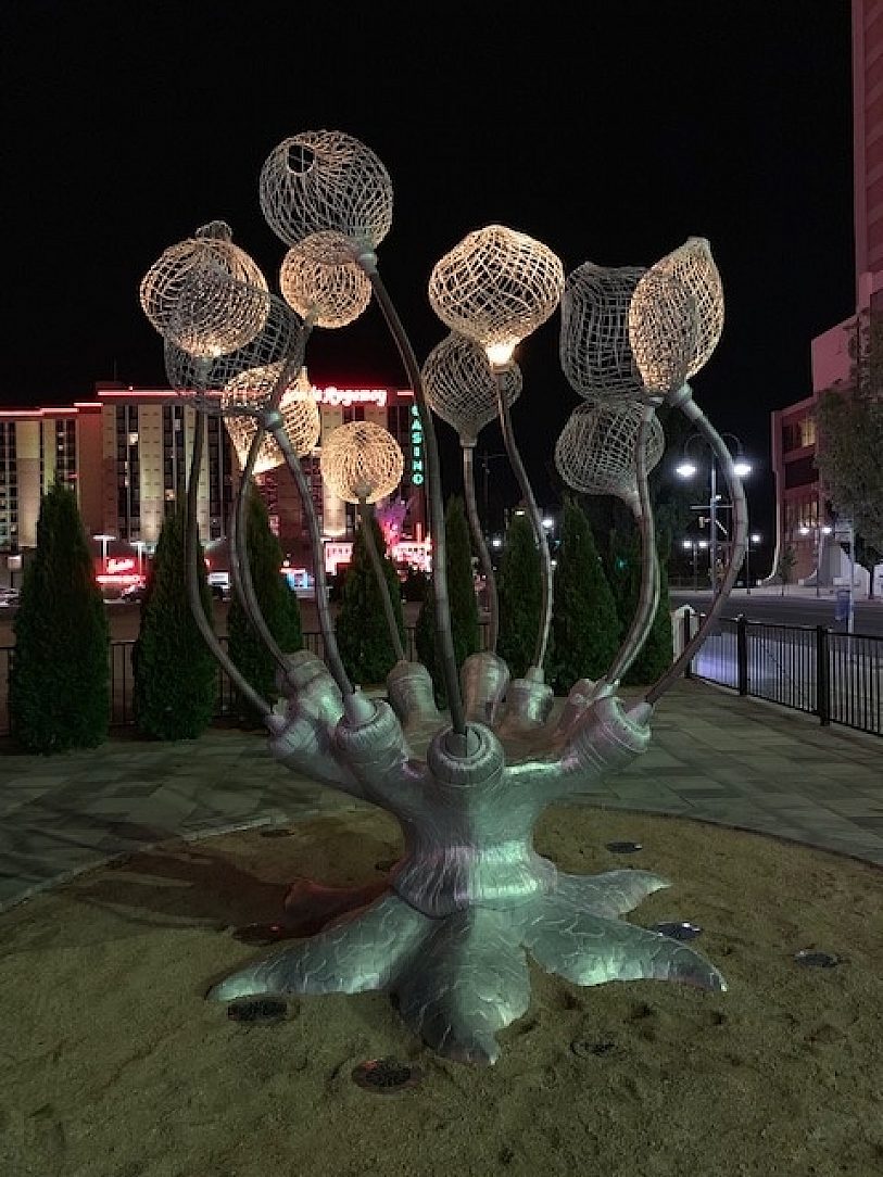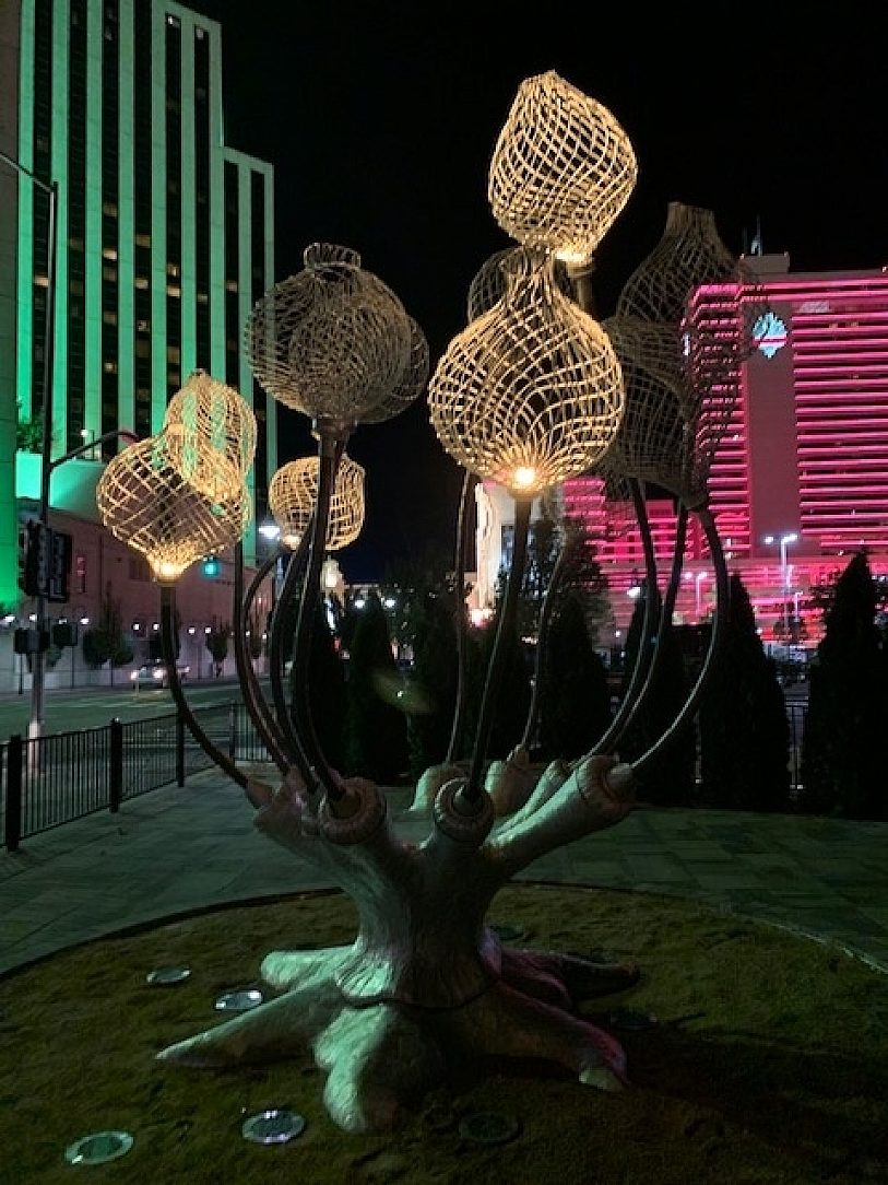 Located in downtown Reno, Nevada, Bloom is a masterful hot-dip galvanized art piece that stands 20’ high and 8’ wide. Michael Christian, the owner of Xian Productions, created the sculpture in four sections. The bottom base area is comprised by plasma cutting hundreds of small oblong parts then welding them together to create the coarse, bark-like texture. The eleven shoots were made from meticulously bending hundreds of quarter inch wires, then welding a steel ring to hold them together. The third section, the stalks are fabricated from round tubes cut into different lengths and welded together to give the look of progressive grown over many years. Finally, the beautiful blooms on the top of the piece are fabricated from half inch wires woven together to look like flower buds. Each bloom holds a light, set to dim and glow at different times throughout the night.