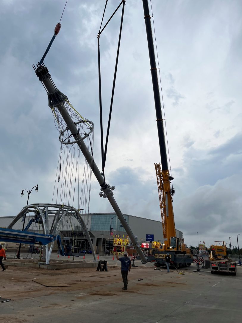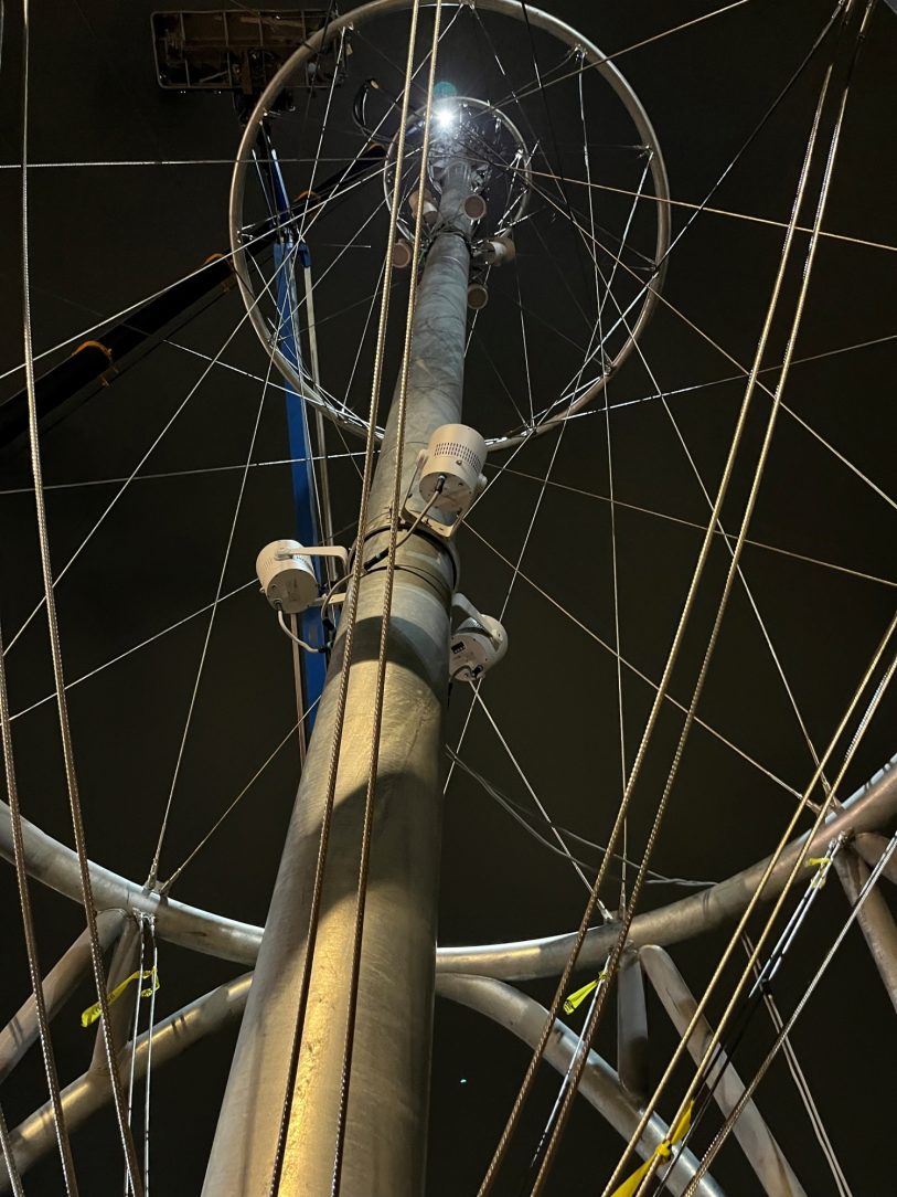 From concept to fabrication to installation, every stage of this tower’s development is remarkable. With a 27-foot by 27-foot base made solely of radii and parabolas with zero corners, its construction is extremely unique. The upper mast tension assembly required extra special care to galvanize with the expected quality due to its complex and structurally critical design. Enveloped in a mesh of steel cable, these supports are tensioned at 8,500 lb. each. This required a 100-ton jack working 29 hours straight as they pulled together a cumulative 140,000 lbs. of cable tension to get the system secure. “Once you start, you can’t stop, because the tensegrity cable system is quite literally holding itself together,” said Gus.