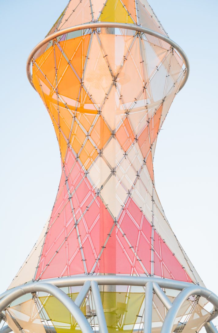 The sculpture features unique 3D-printed stainless-steel material and integrates motion data captured from video taken during fair events, like horse shows. The motion data will then be translated into a colorful array of freely rotating polycarbonate panels, which are laminated with colorful film, becoming the exterior “skin” of the tower. The natural zinc patina also enhances the tower’s aesthetics. Its evolving matte finish softens the structure’s bold geometry and helps it blend seamlessly with both daylight and nighttime illumination.