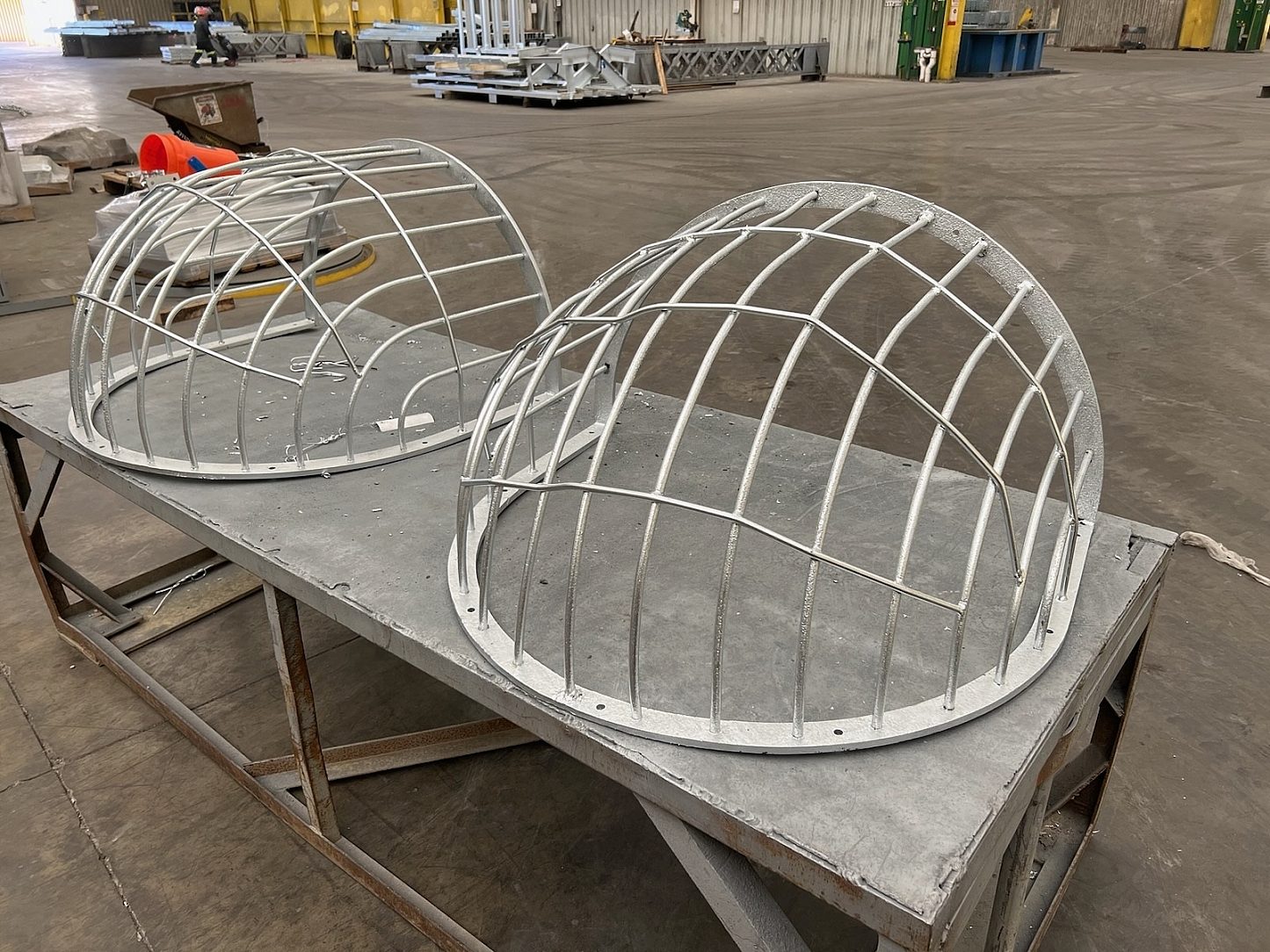 Upon conferring with an outside fabricator, the galvanizer and the zoo's fabrication coordinator, John Martinez, met to review this unique project. Time was a concern, although the zoo's newest baby giraffe, Kinda, won't reach the hanging baskets that her 14 foot tall mother and 19 foot tall father reach now, she will reach them soon! The two took a tour of the galvanizing plant, reviewed other finished and in-process projects and discussed the basket design and use. The galvanizer provided information to Martinez about the animal friendly use of zinc in this application. Ultimately, a solution that was safe, sustainable and long lasting was agreed upon and ready to move to production. To complete this project, the existing baskets first needed to be stripped of the old paint, have minor modifications in design and then galvanized. This work was done at the galvanizer's facility.