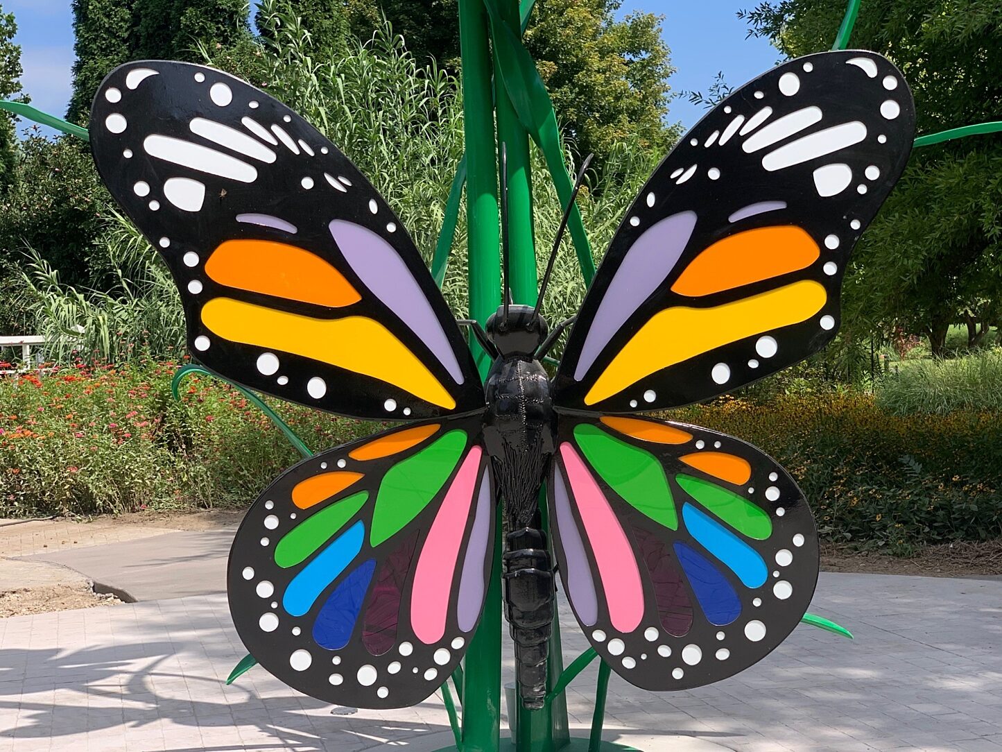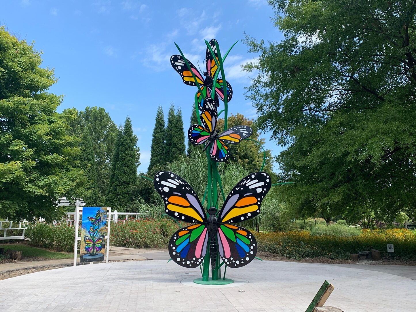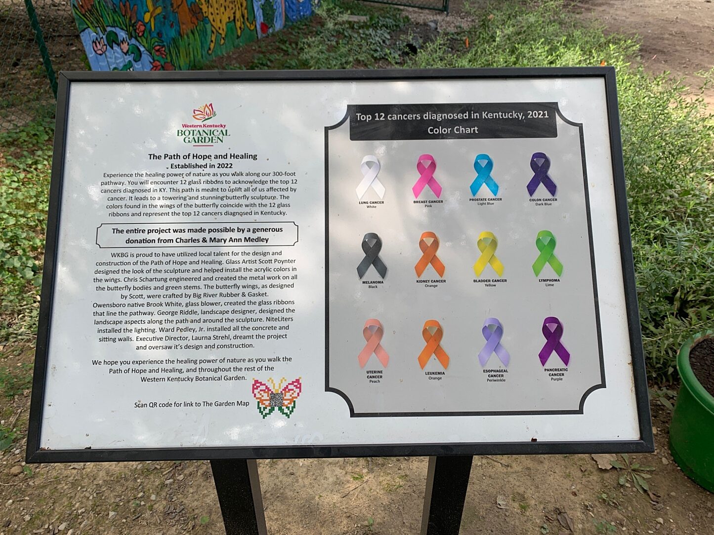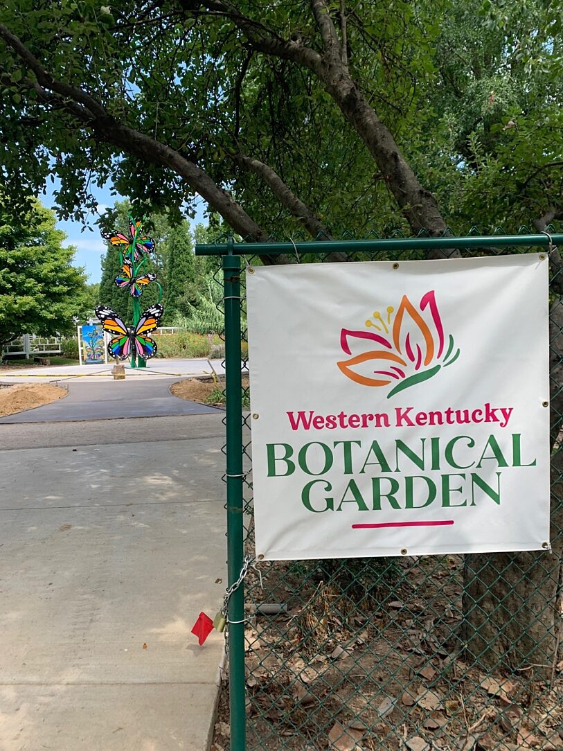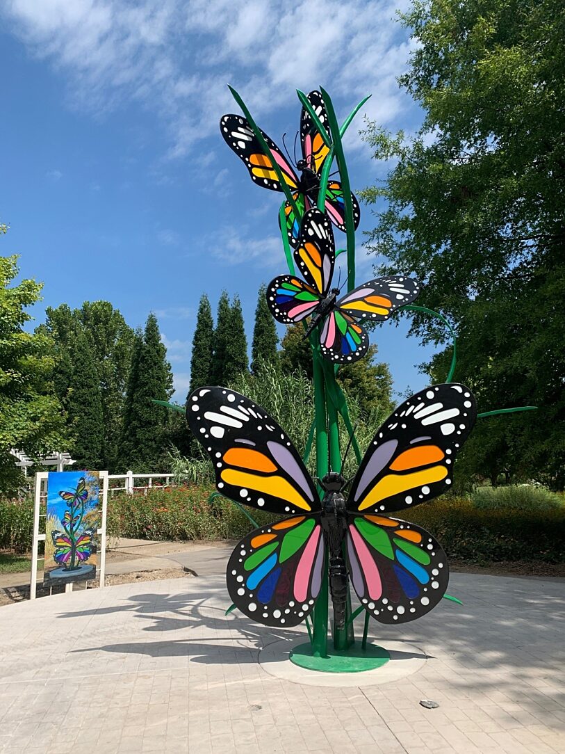Inside the entrance of the Western Kentucky Botanical Garden along the Path of Hope & Healing stands a beautiful 21’ tall butterfly sculpture. Designed by artists Chris Scartung and Scott Poynter, the largest butterfly’s 10’ wingspan is adorned with the 12 colors representing the 12 most diagnosed cancers in the commonwealth of Kentucky. There are also 12 matching colored glass ribbons along the garden’s path.