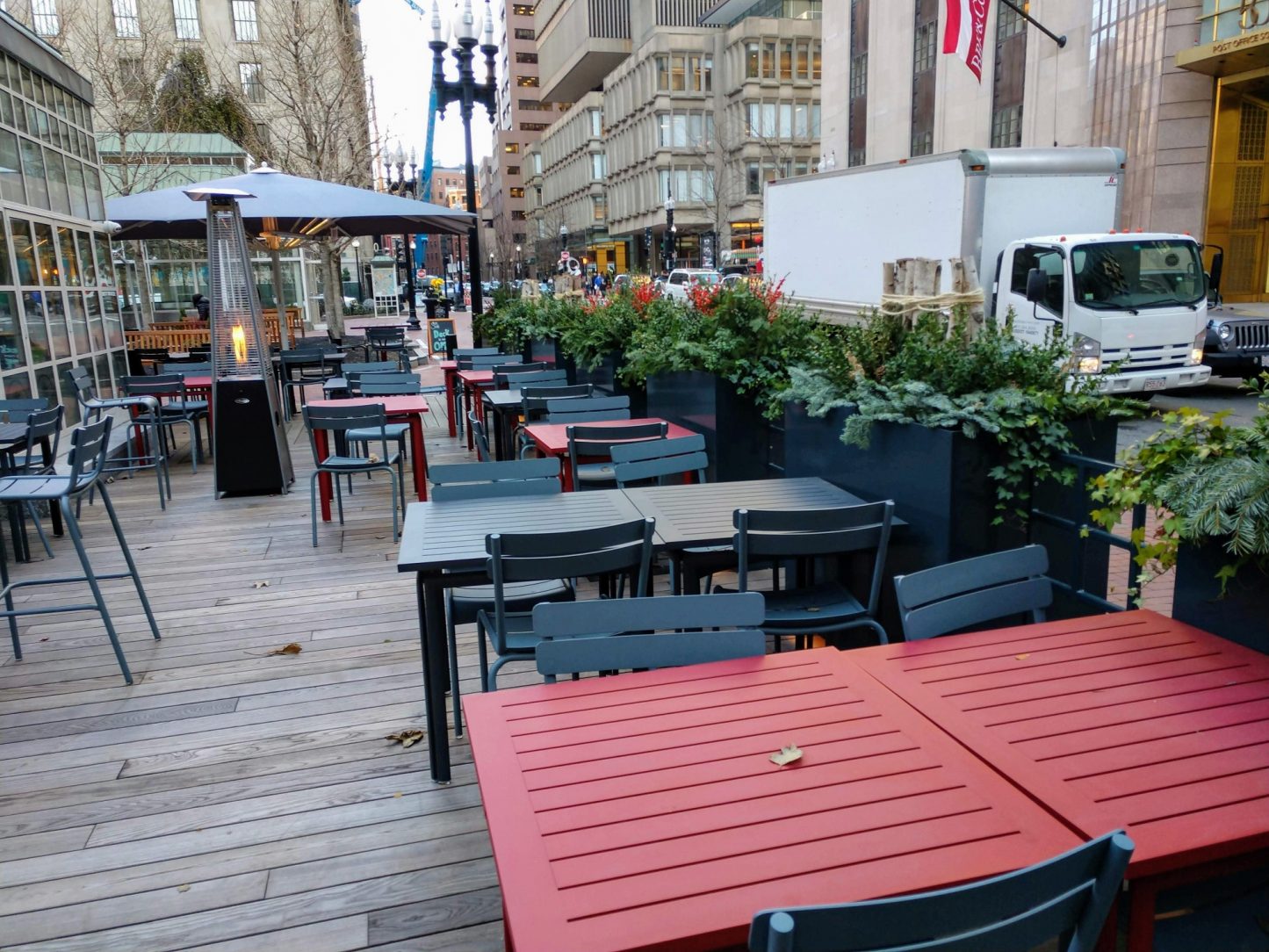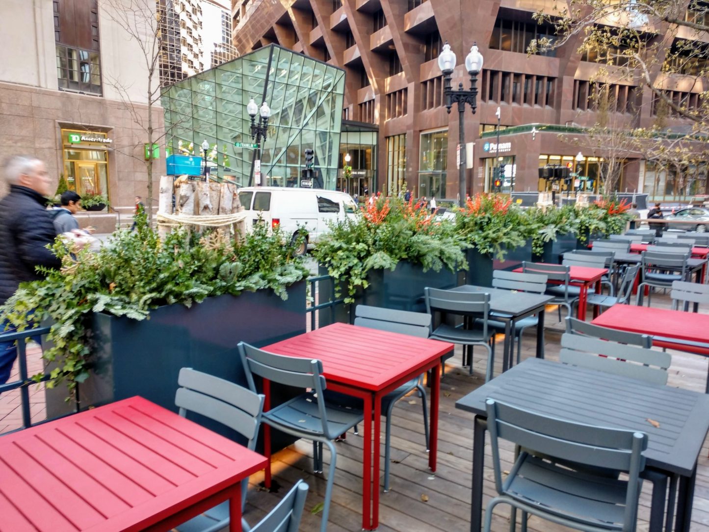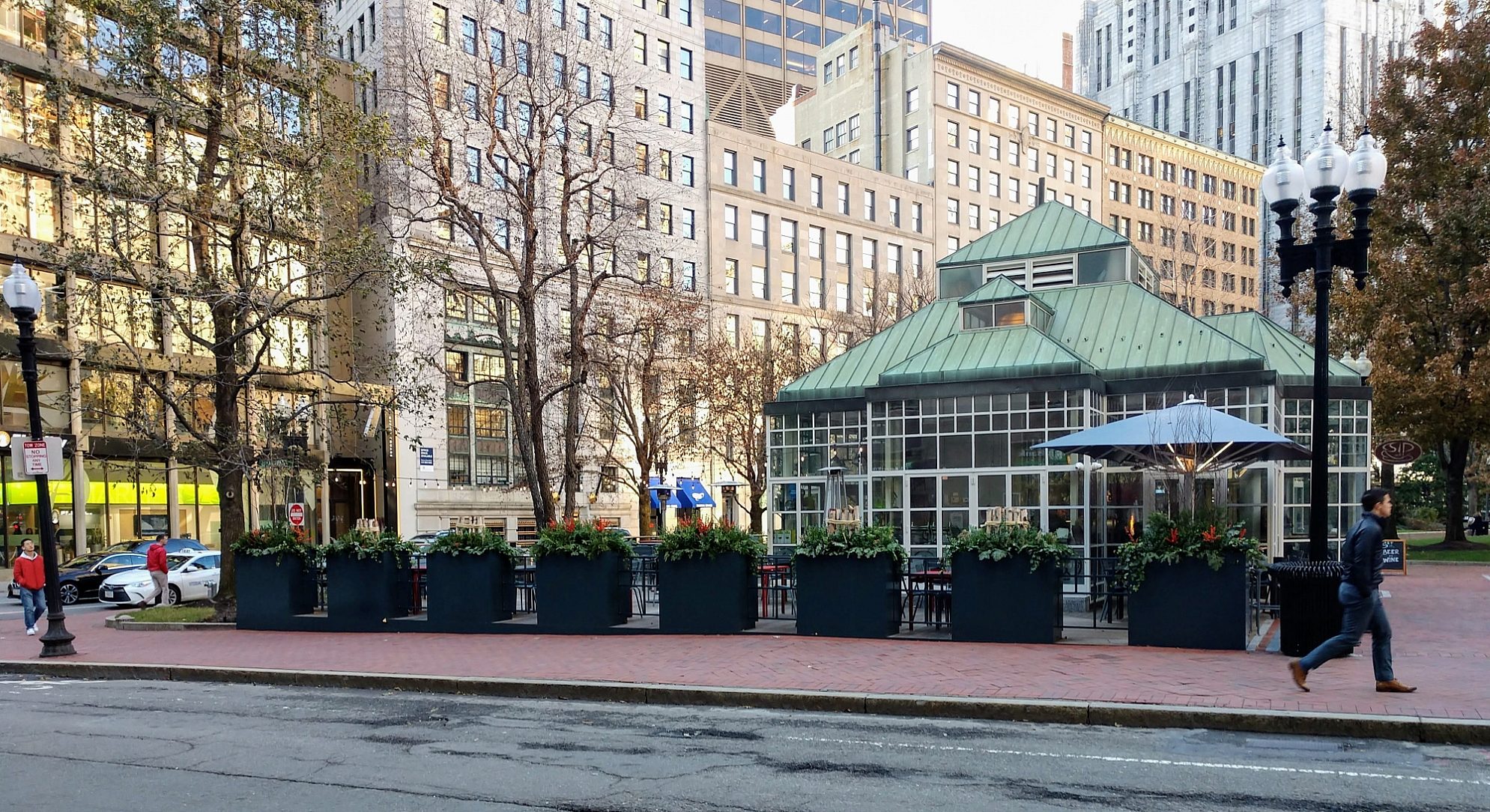 In 1992, the Norman B. Leventhal Park at Post Office Square was opened. Located in Boston’s Financial District, it is one of the busiest vehicle and pedestrian traffic areas in the entire City. The primary architectural feature within the park is in the South Plaza: a glass-and-copper structure, styled as a garden pavilion which houses a year-round café.