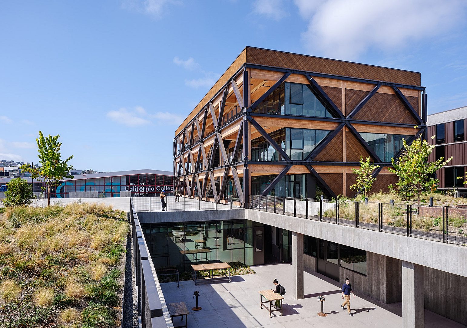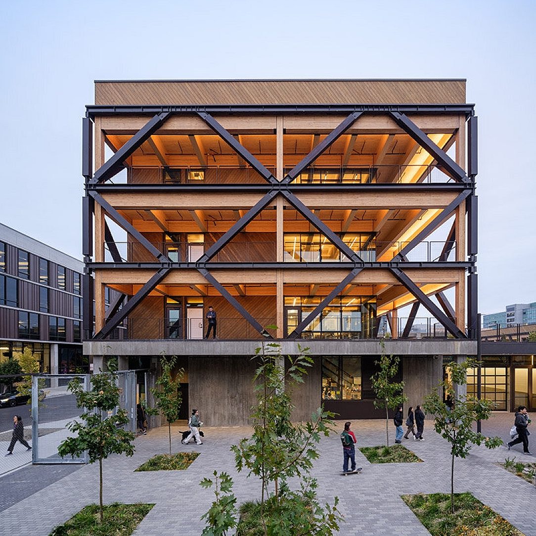 The design of the California College of the Arts Campus Expansion in San Francisco stands as a bold example of forward-thinking architecture, blending mass timber with galvanized steel to achieve both sustainability and performance. By incorporating cross-laminated timber (CLT) and glulam beams, the project drastically reduces its carbon footprint compared to traditional construction methods, reinforcing its commitment to sustainable design.