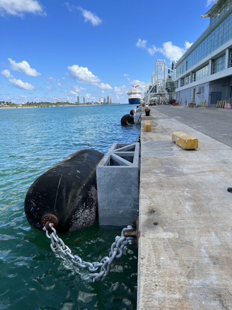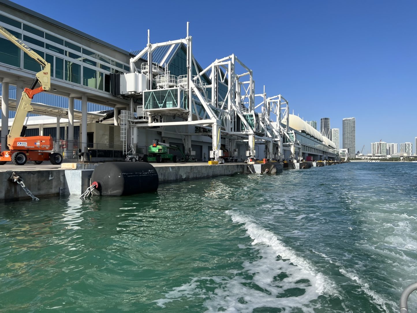 This new vessel has a layout that consists of overhanging lifeboats extending further inland than their other, older vessels. When berthed at Port Miami, this new layout created a potential conflict between the overhanging lifeboats and the passenger boarding bridges' (PBB) structural frame. Unfortunately, the passenger boarding bridges (PBB) are fixed in the North/South position due to the heavy point loads of this equipment, and the need to lay on the pile supported runway foundation system on the apron. The only other way to achieve a proper and safe distance between the overhanging lifeboats and the PBB was to create a standoff between the vessel and the seawall. That’s where the idea for the fender backing frames was born.