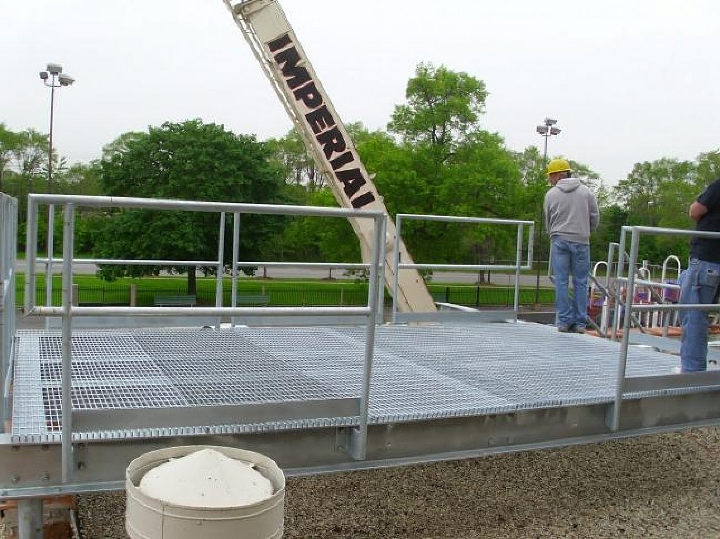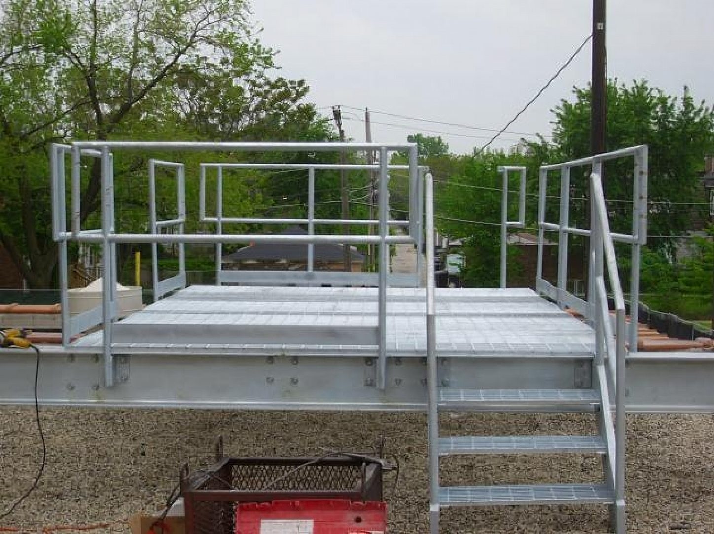 The entire cell tower platform site consisting of I-beams, stair treads, railings, grating, pipes, support cross members, bolts, and hardware