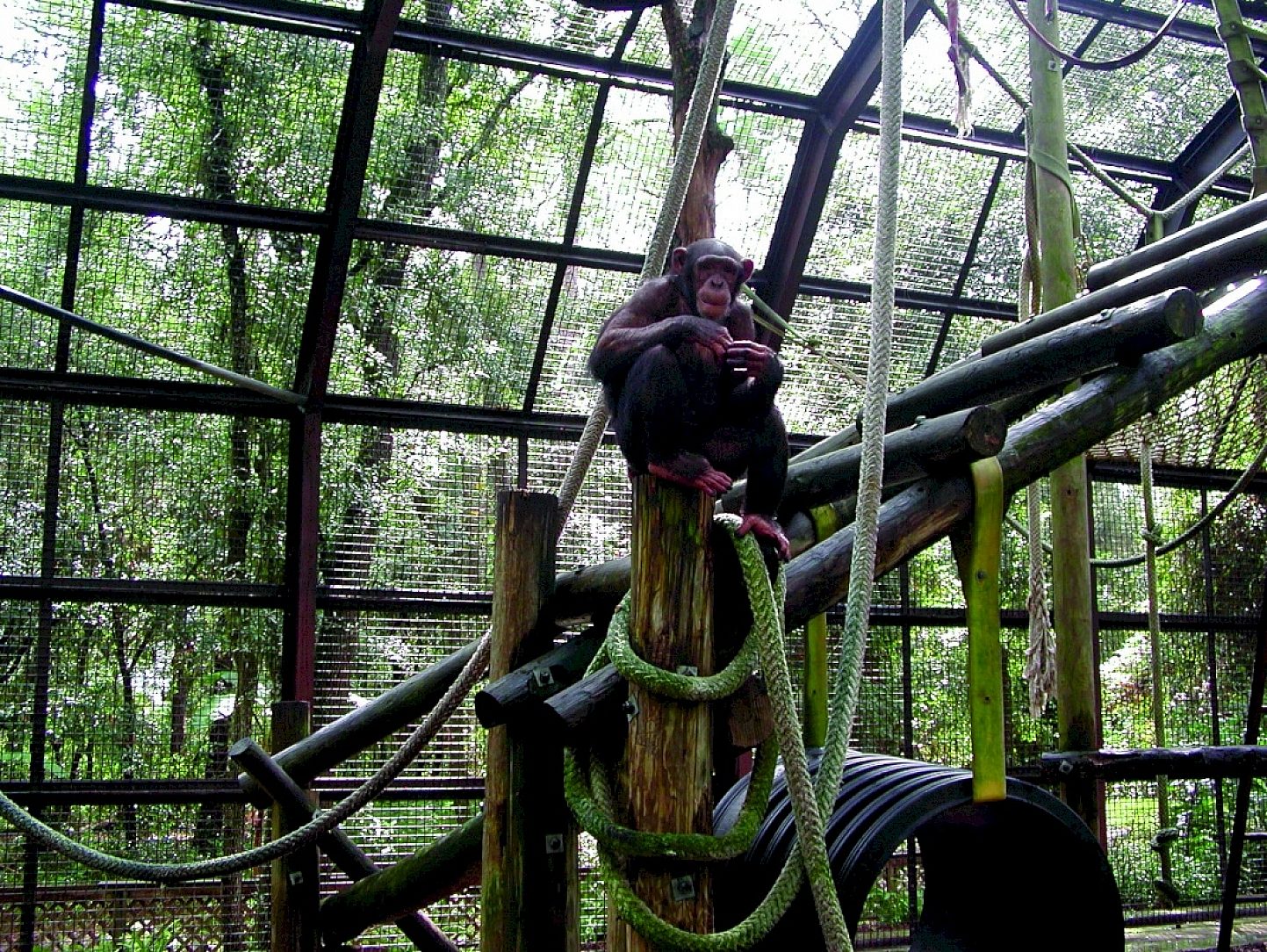 The clinic, night house, and all habitats are connected by a system of chutes and walkways elevated 10 15 feet above the ground to give the apes the feeling of traveling through the trees. These chutes and walkways are also made of hot dip galvanized steel angle, channel, and mesh. They have tracks made of galvanized flat bar welded down the lower inside portion of the walkways in order to give the apes a smooth surface for walking.