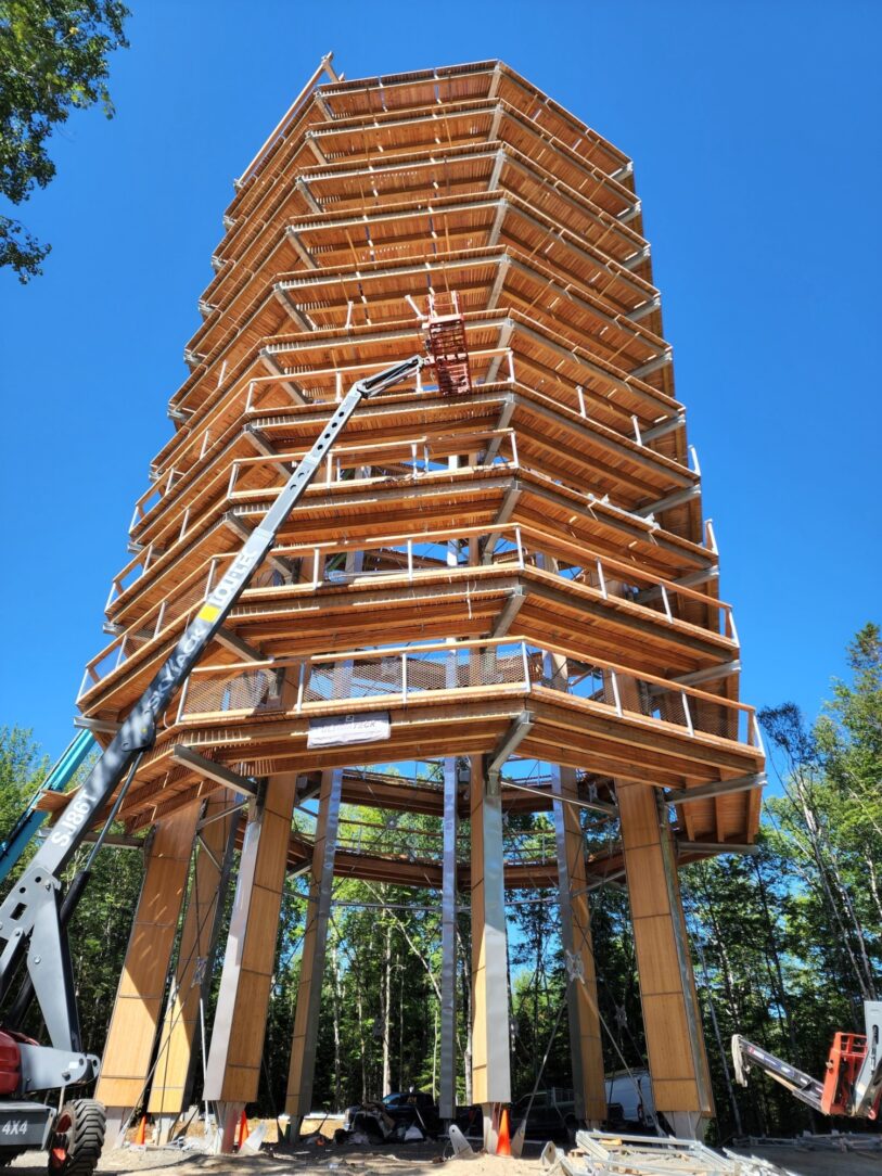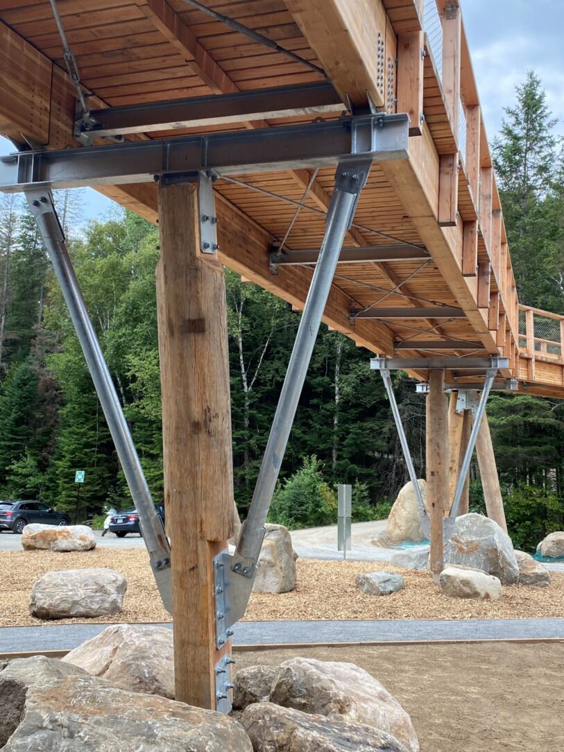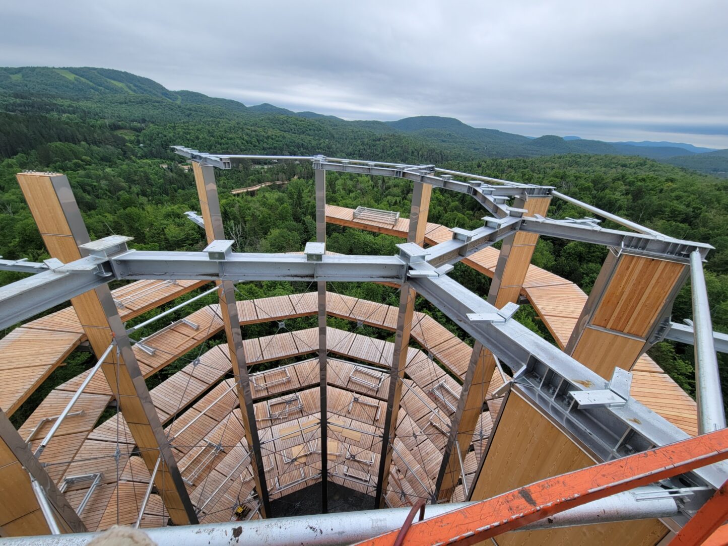 Like milk and cookies hot-dip galvanized steel and wood have an affinity together. This aesthetic fact was behind the idea for what construction materials would be best for a striking elevated walkway and observation tower in the skier’s haven north of Montreal, Canada known as Les Laurentides (The Laurentians).