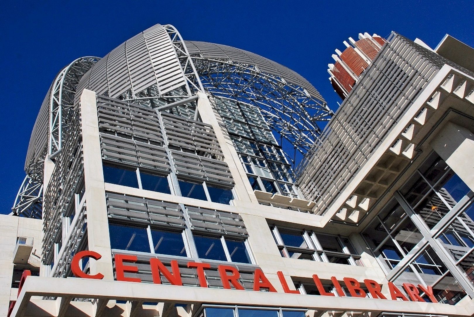 The 497,000-square-foot facility is twice the size of its predecessor with a grand total of nine stories. It features a truly magnificent exposed galvanized arched domed terrace, 350-seat auditorium, three-story reading room, advanced technology center, art gallery, day care center, cafeteria, outdoor garden courtyard and even a charter high school occupying the sixth and seventh floors. On-site parking is available in a garage under the library.
