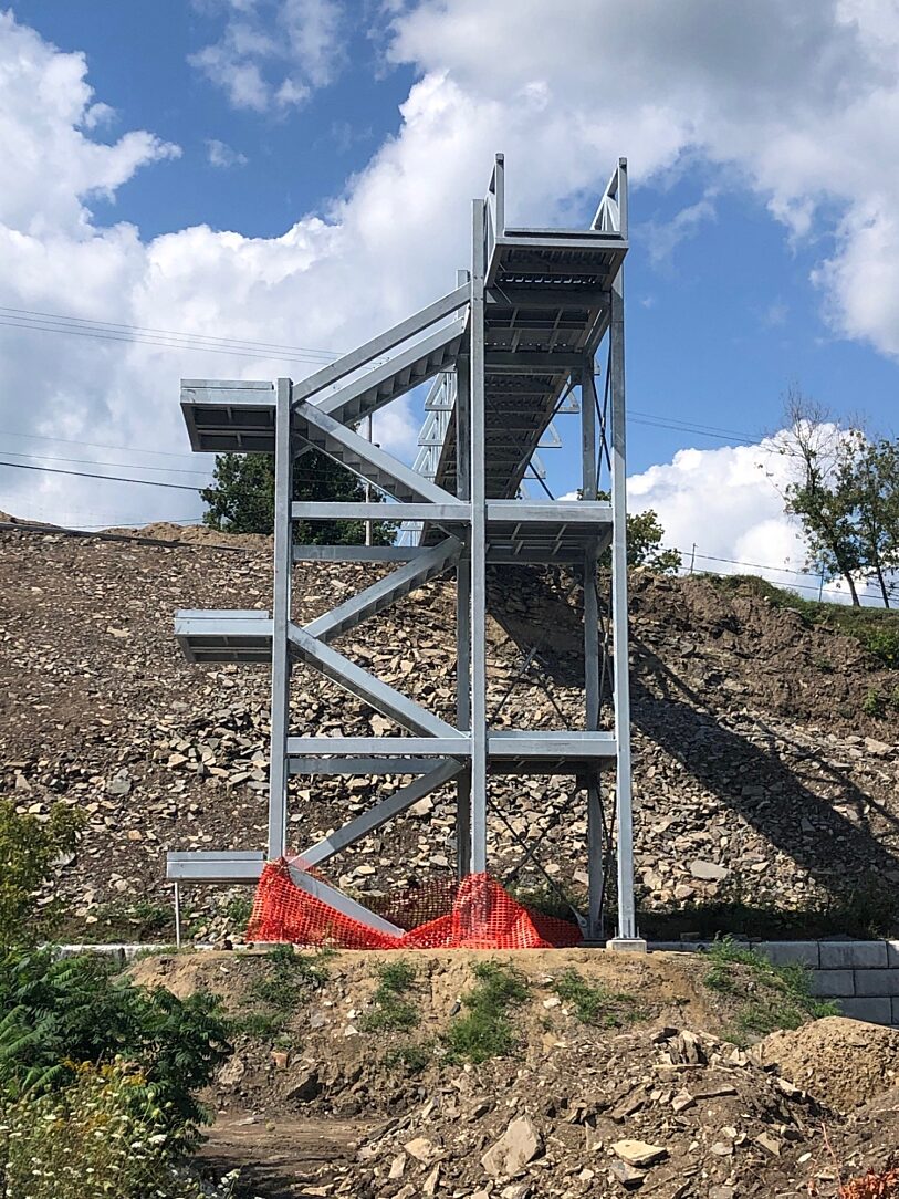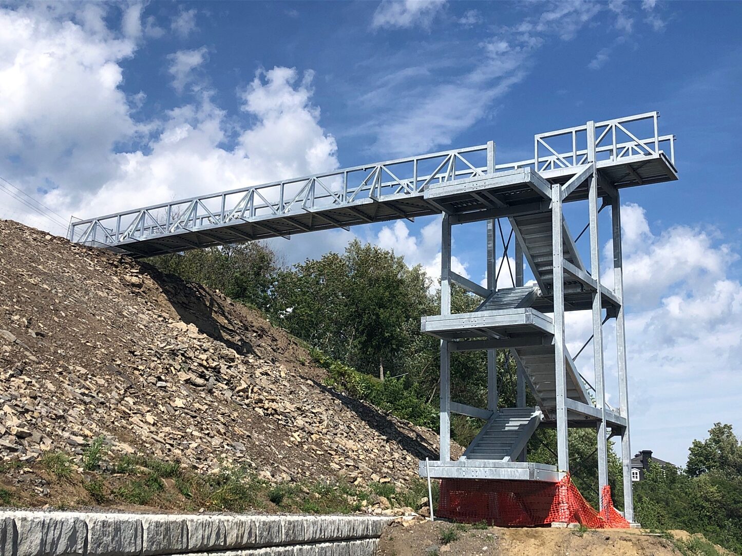 A very close call, that could have had easily been a tragedy and the continued growth in heavy truck traffic from a nearby quarry finally motivated the town into action. Given the small population and tight density of historic homes that surrounded each end of the road meant a major change to the road layout wasn’t an option. The only remaining solution was a pedestrian bypass, a raised walkway and staircase. With no such experience in this kind of construction the town approached the DOT, who advice made clear that hot-dip galvanizing was a must to insure minimal initial cost and maintenance while also maximizing service life.