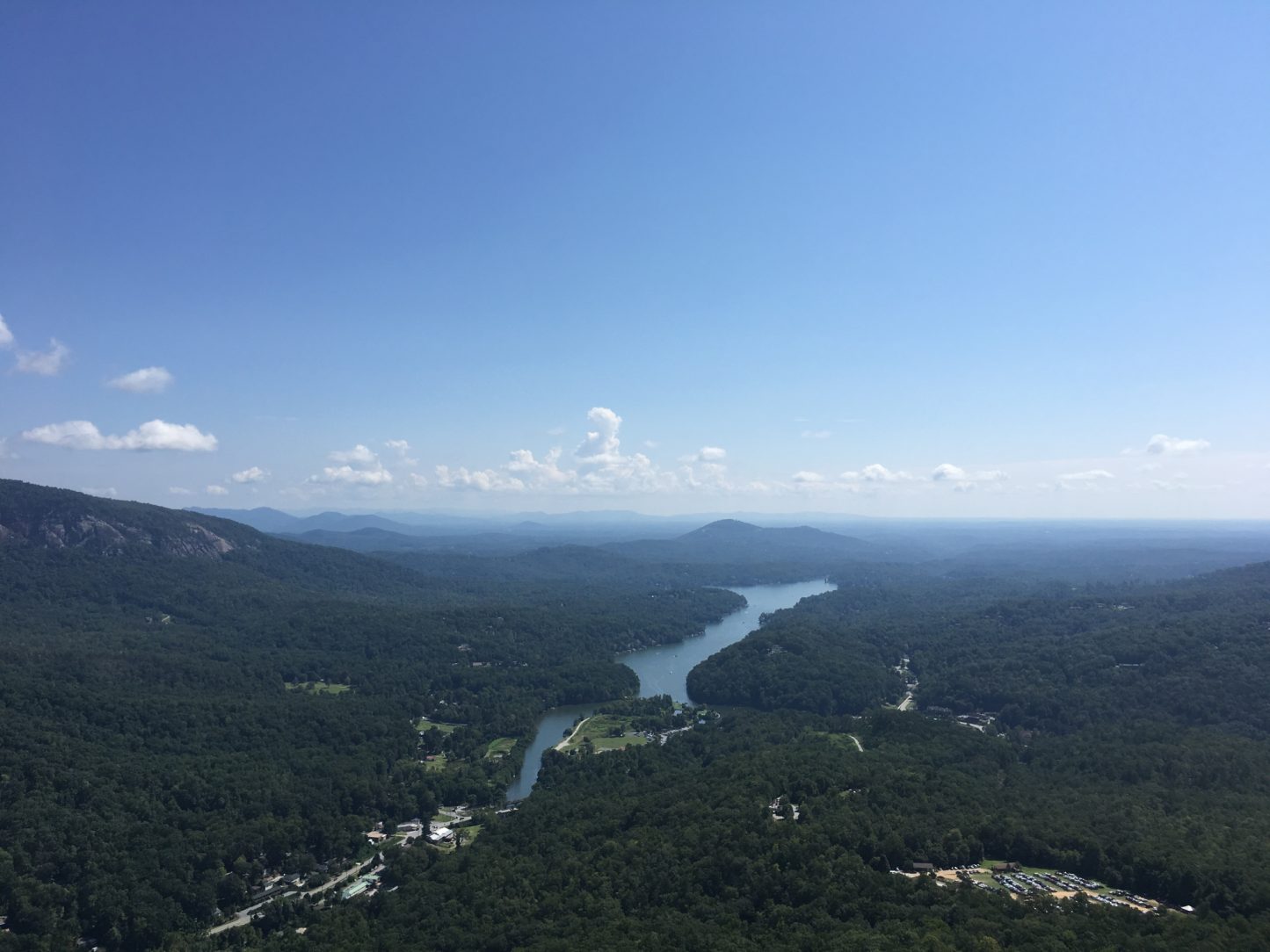 Chimney Rock State Park’s Outcroppings Trail offers hikers a series of staircases and lookout points threaded through a near-vertical boulder field. The strenuous .4 mile trail takes hikers to several points of interest including Vista Rock, the Grotto, Subway, Pulpit Rock, and Chimney Rock itself. After the 491-stair, 315-foot climb to the top, visitors are greeted with a sweeping view of Lake Lure and the Hickory Nut Gorge below.