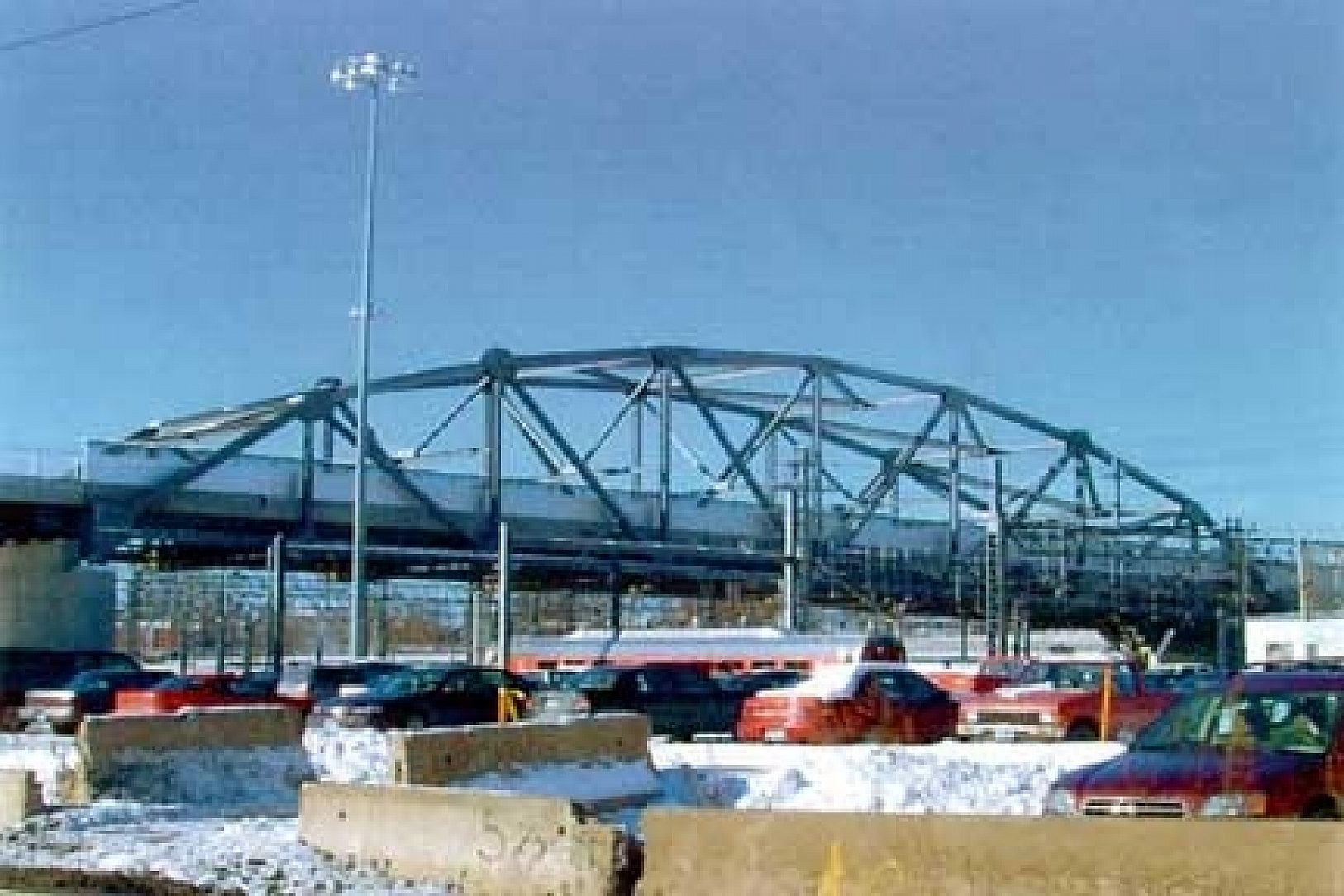 The world's largest mobile crane was used to lift the truss into position. Hot-dip galvanizing was the preferred corrosion protection system over metallizing because it was competitive on an initial cost basis, was durable enough to withstand the rough treatment during assembly of the truss on the ground next to the bridge site, and would minimize future maintenance in the very restricted access area over the train yard. Also of concern to the Connecticut DOT was maintaining a zinc coating thickness of six mils or less on the high silicon steel in order to minimize overall truss weight and to deliver faying surfaces as specified in the truss design.