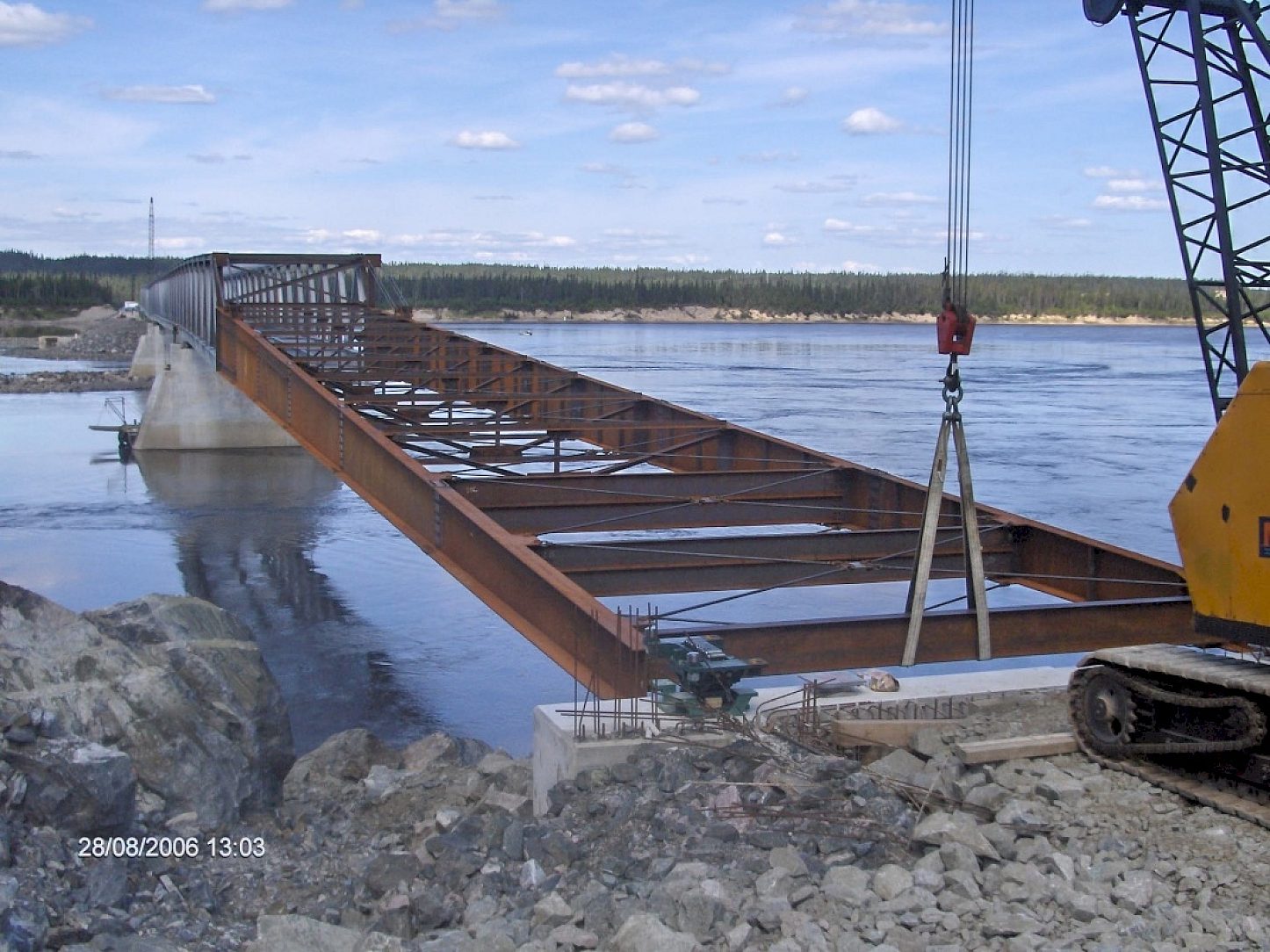 The Churchill River Bridge is the largest bridge in the Trans Labrador Highway, which will link the giant hydro-electric projects in the interior of Labrador with the coast at the Strait of Belle Isle, and the ferry link to Newfoundland. The Bailey style, cantilever bridge was assembled on land and then pulled over the river with special purpose machinery.