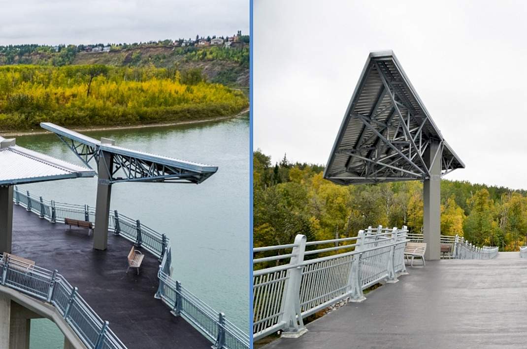 More than 850 metric tons of hot-dip galvanized US steel was used to create more than 950 feet of bridges, including the embedments, stringers, cross members, and all major structural support elements. The flooring was also galvanized and coated with a special grit surface. As the bridge was galvanized many miles away from where it would be erected, careful packaging and precaution was taken to guard against wet storage stain during transit.