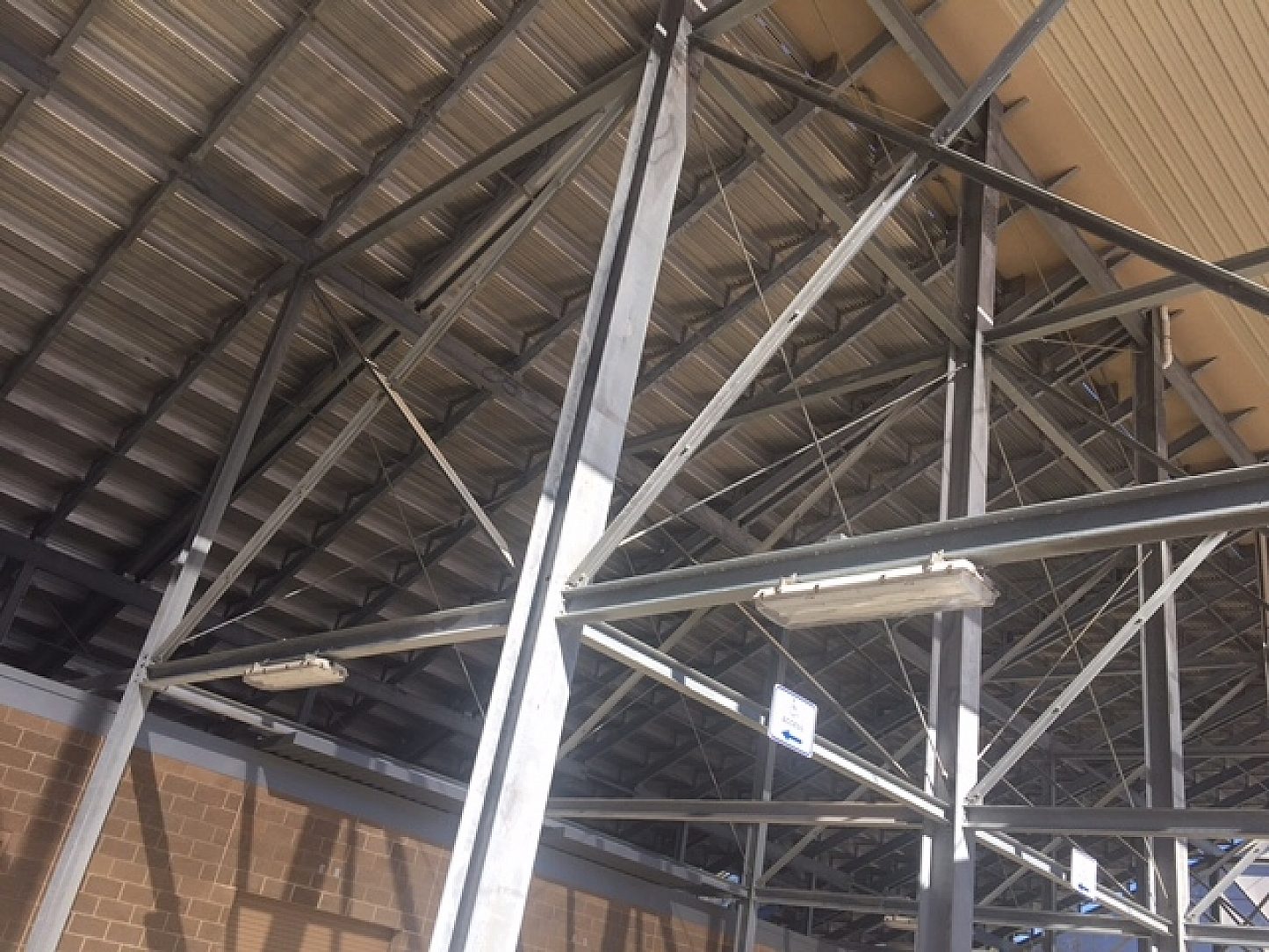 All structural beams, braces, hand rails, the entry arch and tiger face at the main entrance. All the stairs and bleacher supports were galvanized.