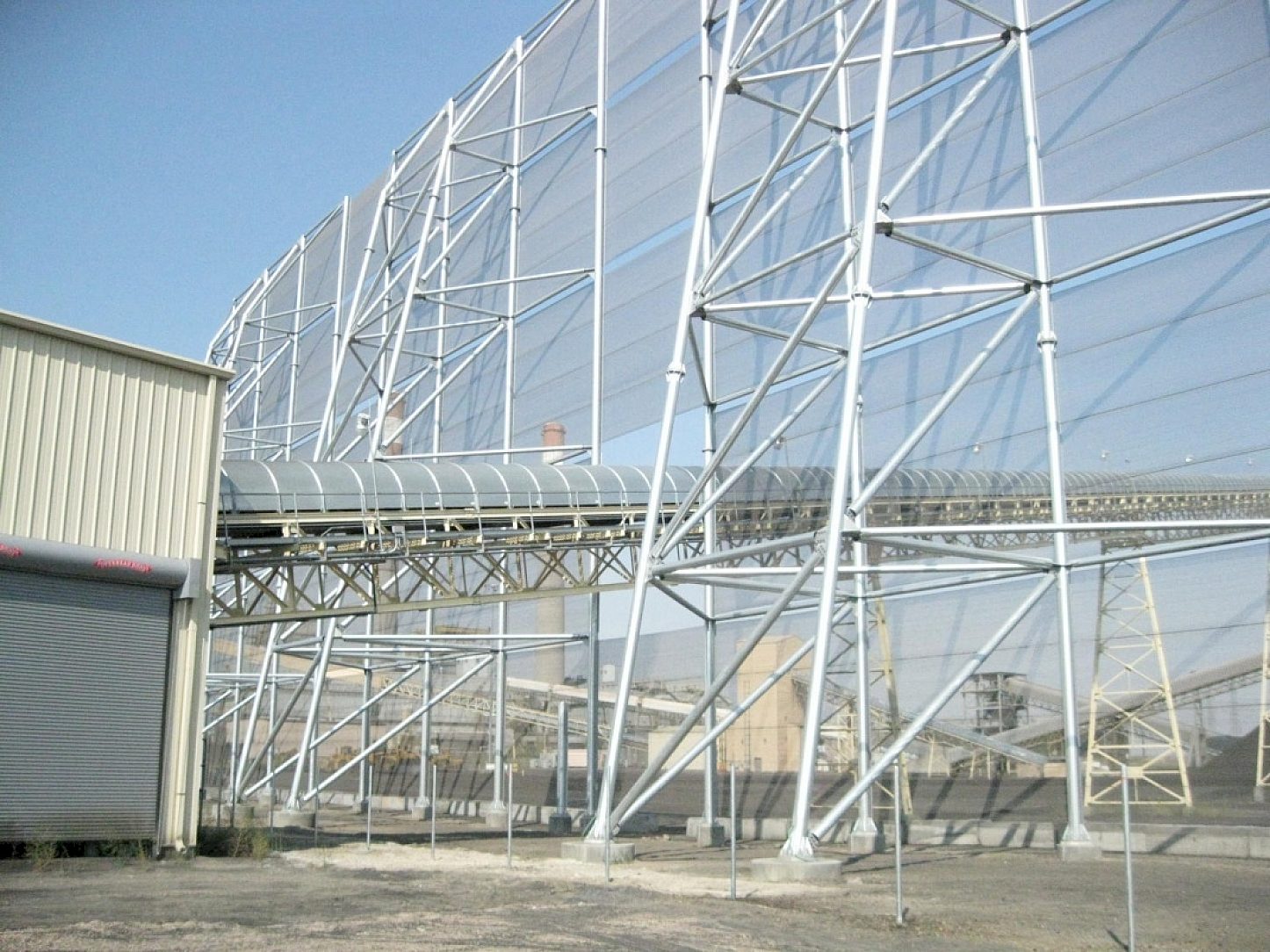 Comanche utilizes a low-sulfur coal from the Powder River Basin near Gillette, Wyoming, but would need to increase this raw material inventory in order to maintain maximum output. The additional coal inventory did raise some environmental concerns with trace amounts of coal dust escaping the facility. The Coal Pile Wind Fence, using advanced technology and hot-dip galvanizing (HDG) is a unique solution to this situation by reducing wind velocity and particle movement, thus minimizing dust emissions with consistent reliable results. The fence is made up of nineteen 100-foot tall, heavy wall, 10, 8 and 6 HDG steel pipes designed to support a durable fabric-mesh for capturing the escaping dust particles.