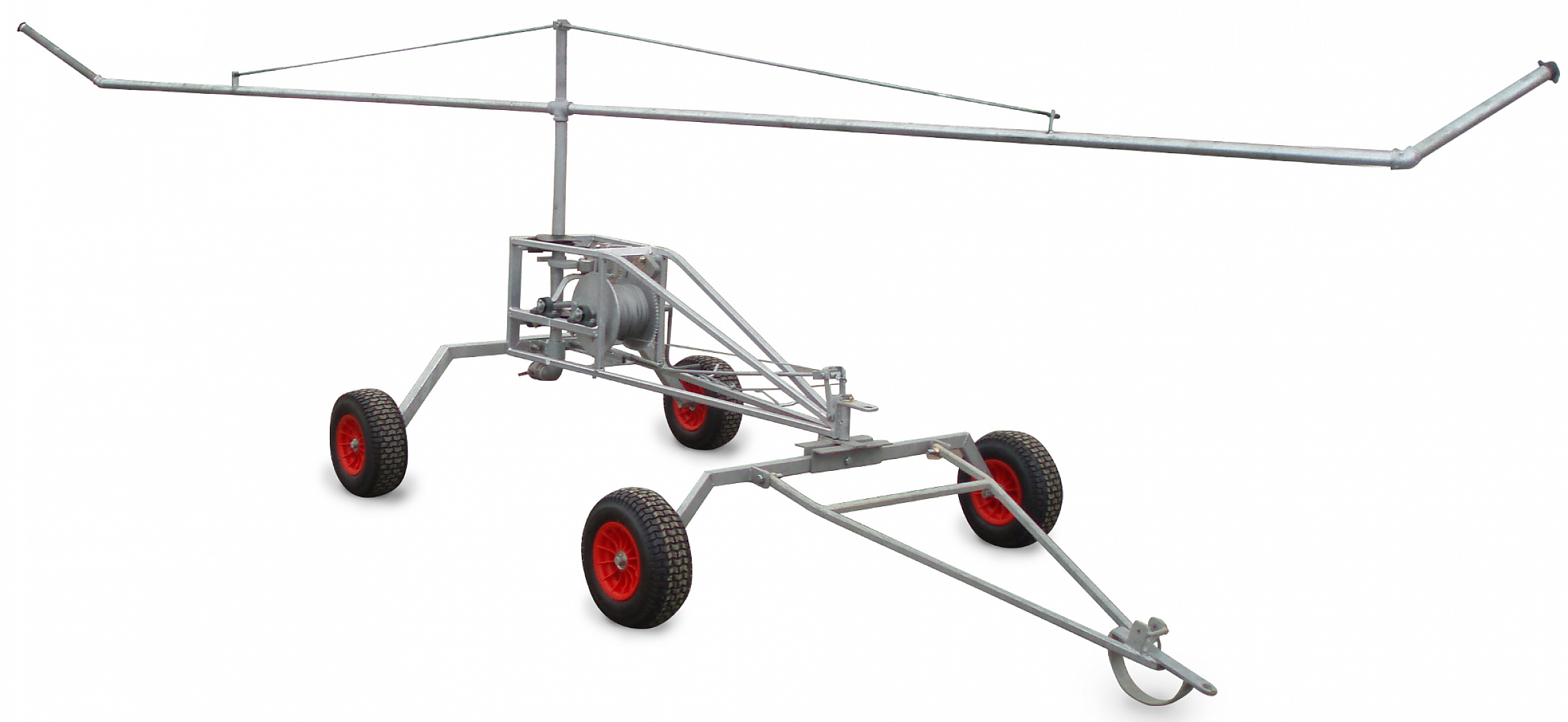 The irrigator works by attaching the cable located in the middle of the irrigator to a post or tree on the opposite end of area needing irrigated. There is 1000 feet of cable available for the larger fields. The irrigator has a galvanized winch system, so once a water hose is attached to the back of the irrigator, the winch will rotate pulling the irrigator toward the attached anchor. The irrigator has a 45 foot long boom fabricated out of 2” hot dip galvanized pipe, and can spray up to 164 feet covering 4 acres per pass. The body of the irrigator is 2” galvanized square tube and flat bar. The stem that holds the boom is also made out of 2” hot dip galvanized pipe. The parts are sent to the galvanizer unfabricated. They are then assembled at Vaughan’s facility to ensure the irrigator is fully functional and can withstand the elements the irrigator will be subject to.