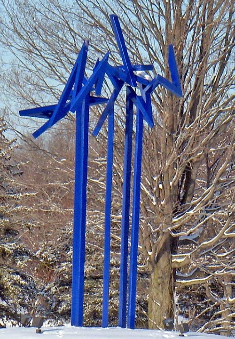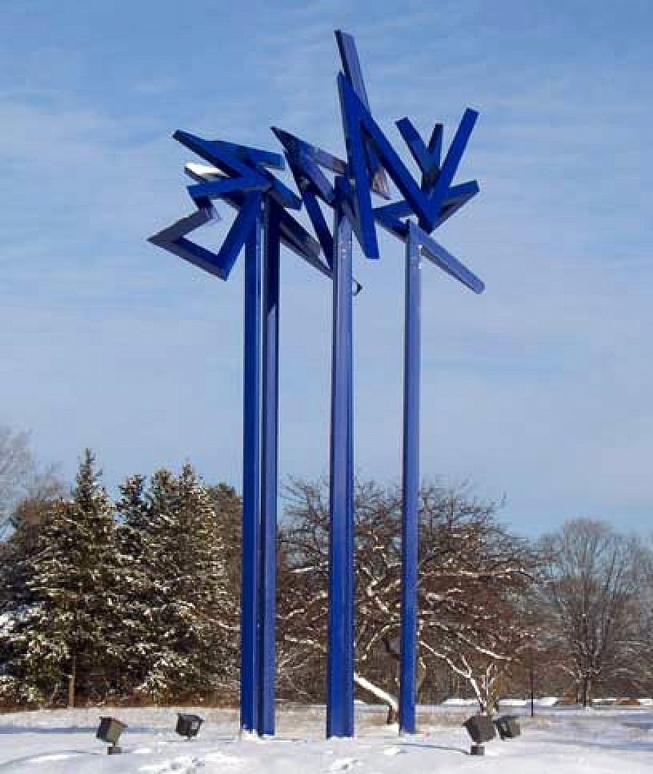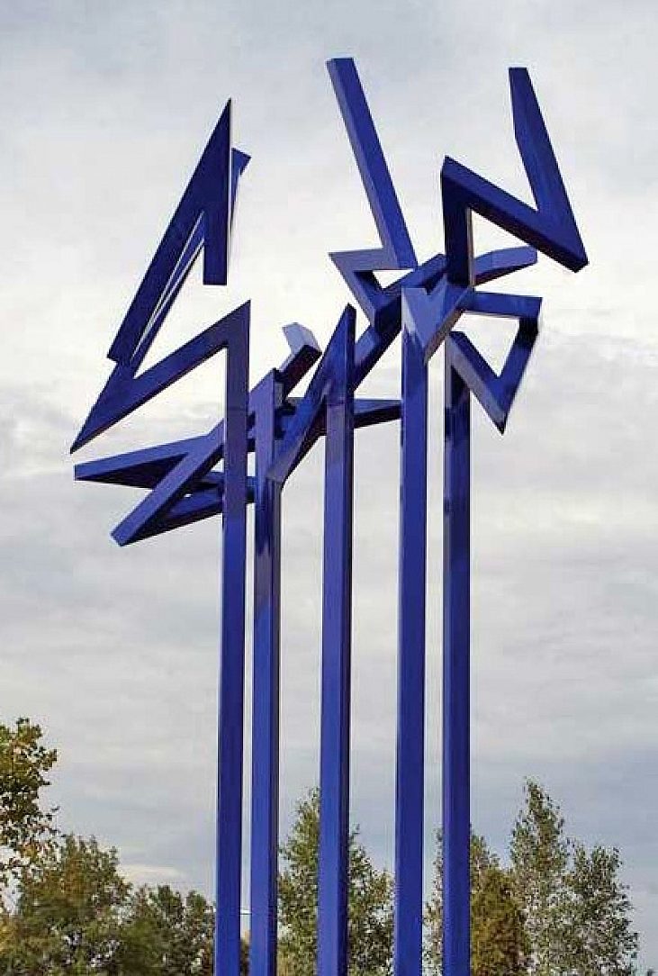 Zigzagging across the New York sky, the Crown shines brightly blue over the Griffiss Business and Technology Park. This was a first time galvanizing experience for artist and sculpture Rainer Maria Wehner. She chose hot-dip galvanizing (HDG) not only for its protective qualities, but also for its affordability. Not only was HDG more affordable than the competing three-coat paint system, it exponentially increases life expectancy. Wehner desired a very smooth finish for her masterpiece.