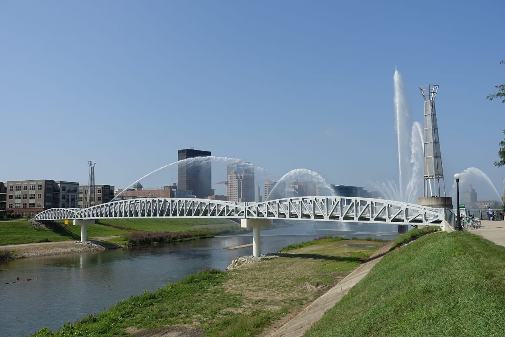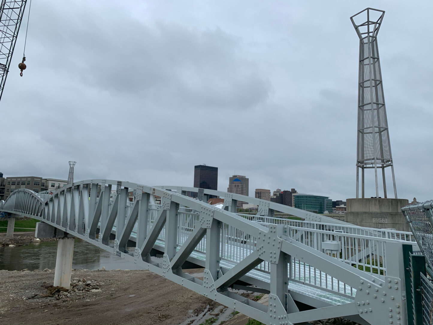 State engineers and other experts only learned that continuous water exposure meant the structure would keep rusting. Continuous water from the fountains in the river got inside the square tubes that held up the bridge, which means it rusted from the inside. The old bridge also was “whitewashed” by constant exposure to the river fountains, the old bridge was green in color but the new one will be silver, which matches the spires around the RiverScape. The silver paint should not fade in the same way. The new bridge was replaced by galvanized steel and uses beams instead of tubes.