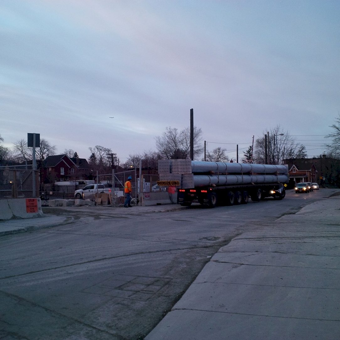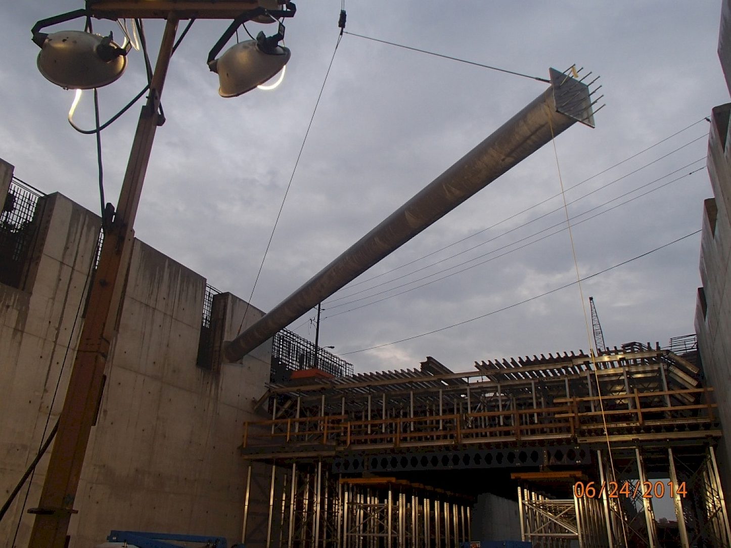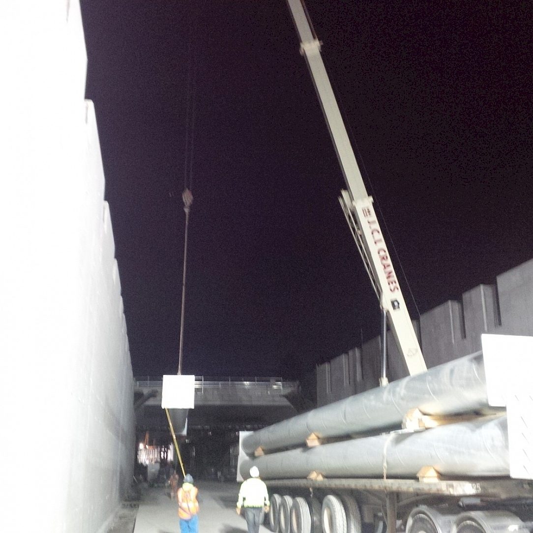 Pilings were loaded 6 per truck and offloaded by crane and place directly into position.Installation was done at night taking into account inner city traffic congestion. Night work was coordinated with the schedule of freight train traffic avoiding high daytime frequency of commuter train traffic delays. The first 26 pilings were installed in one week. The remaining 42 pilings were installed over 7 nights. The galvanizers reputation for fast turn time was known to the Fabricator so he could confidently schedule site erection.