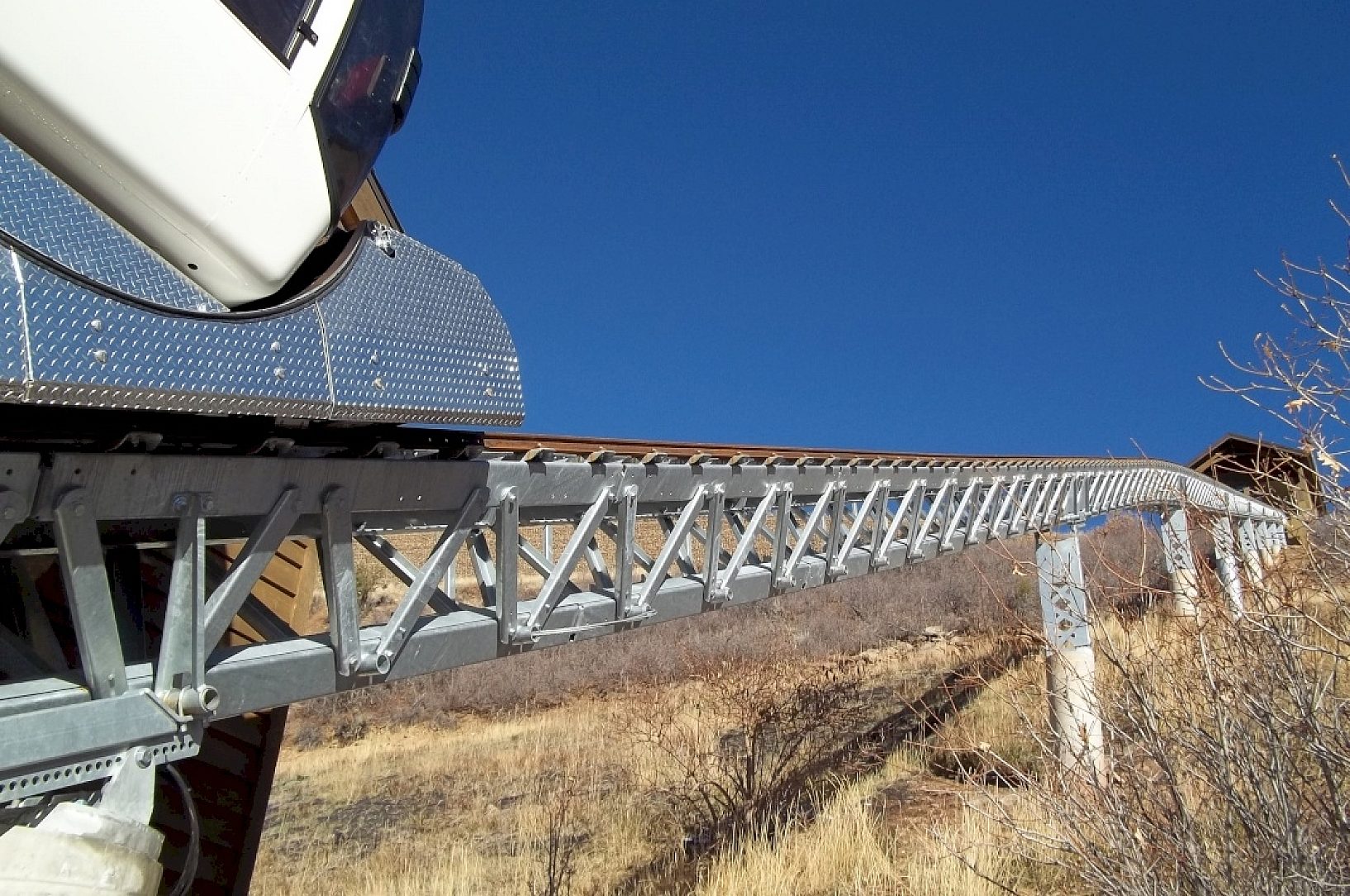 The railway is fabricated completely of hot dip galvanized triangular truss sections fitted with a rack drive assembly down the center of the track for cart propulsion.
