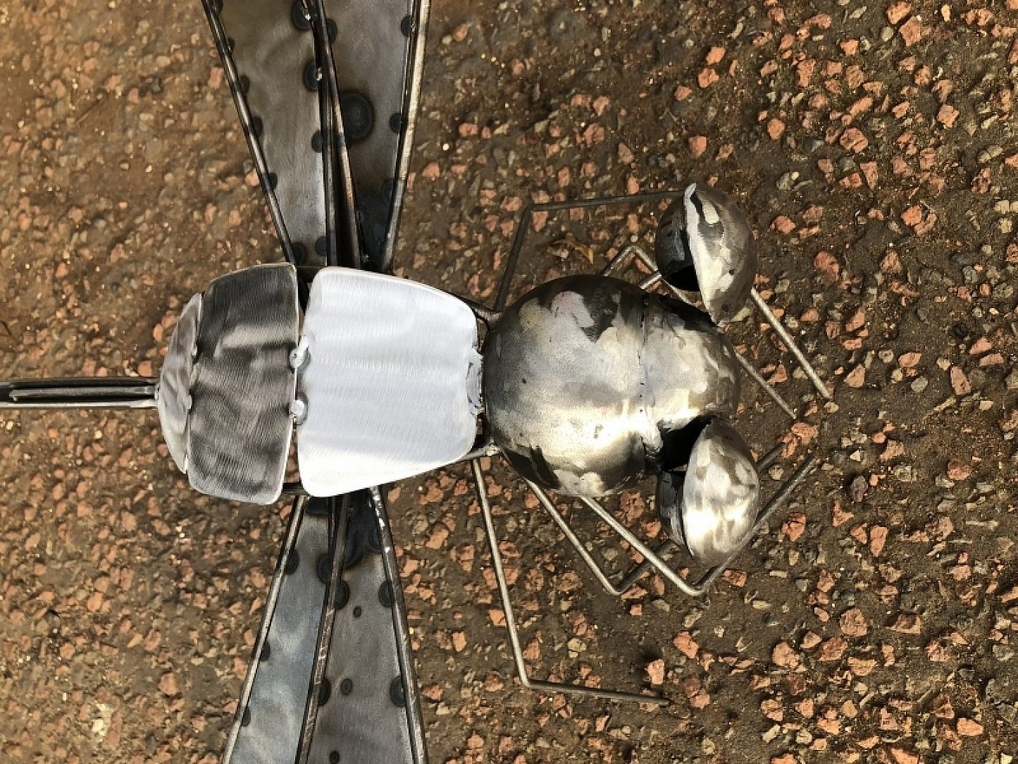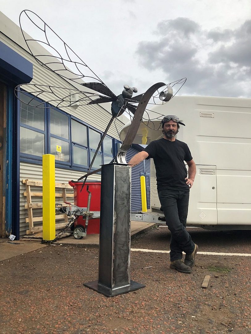 After taking Dennis to two shows, a customer approached Kurt with an offer to buy. However, the customer wasn’t keen on the weathered look, and wanted the dragonfly to be shiny and silver so that it would stand out on the island on a lake, where it’s now installed.
