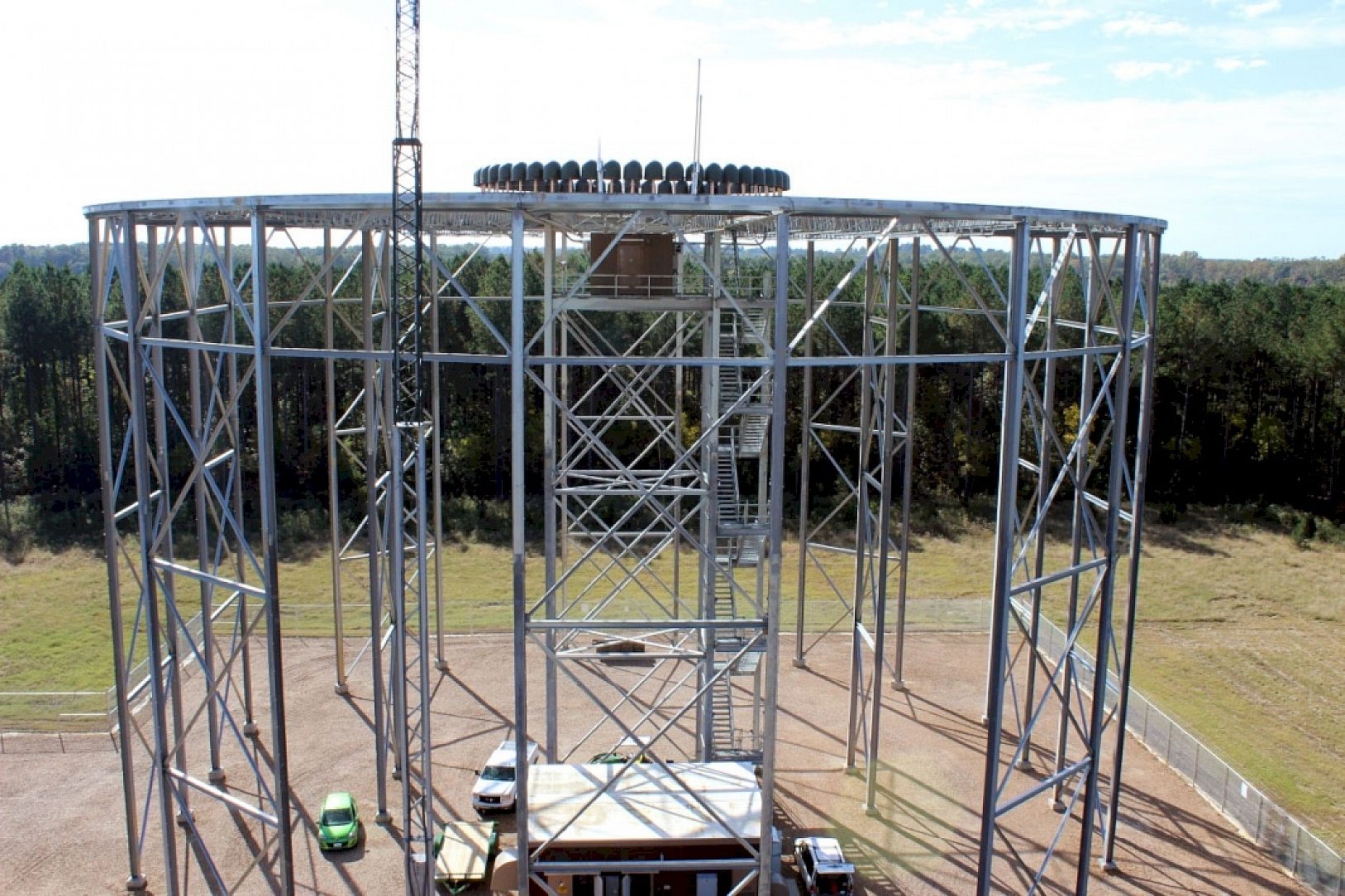 Towering above the tree line near the Madison, MS airport is the Doppler Vortac Tower and Tacan Tower. The Doppler VORTAC tower was built in 2013 to replace an existing VORTAC tower and the TACAN tower was also constructed nearby as part of this project. The VORTAC and TACAN towers will be used by all types of aircraft as a navigation tool for planes coming into or leaving from Bruce Campbell Field. The VORTAC consists of a co-located VHF omnidirectional range (VOR) beacon for civilian and commercial aircraft, and tactical air navigation system (TACAN) beacon for military aircraft. The VORTAC tower stands approximately 90 tall and 150 in diameter. The height of the VORTAC tower allows for better frequency and signal of the navigational aid. The TACAN tower is also 90 tall and will house state of the art navigation technology as well.
