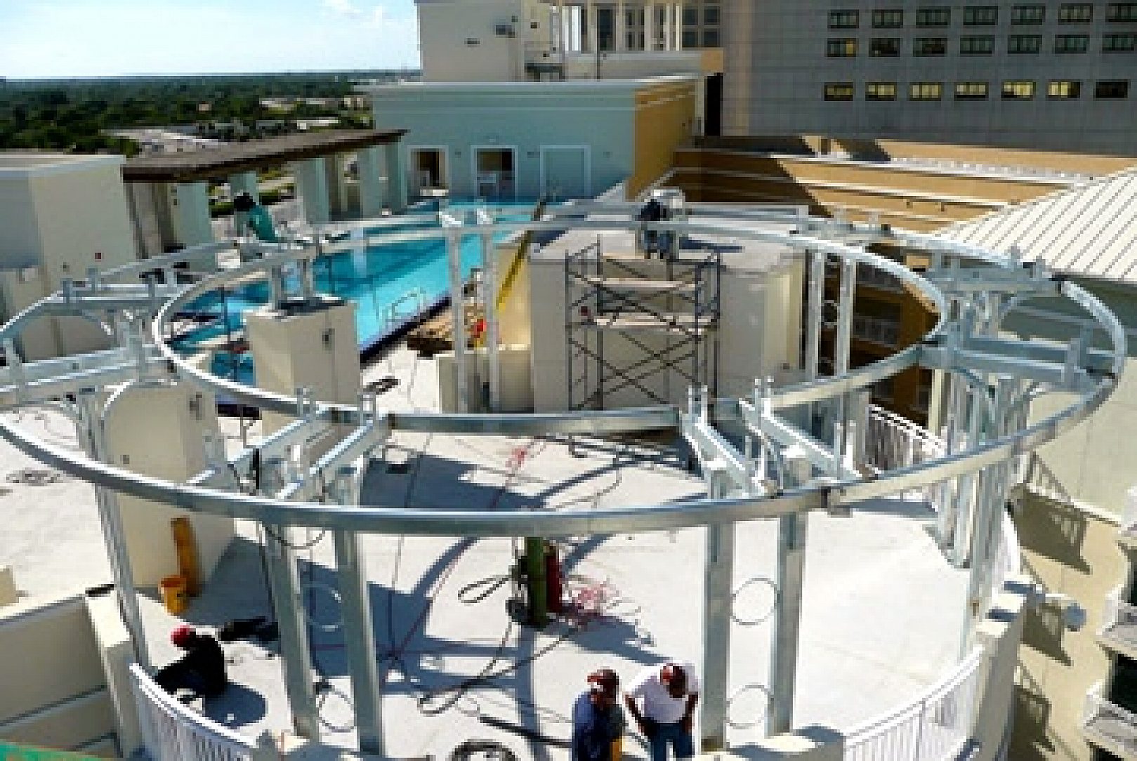 Highlighted in a bright aqua green, the Downtown Dadeland Residential Condominiums trellis is the centerpiece of the residences outdoor pool and patio area. A high chlorine and salt water atmosphere called for materials that could stand the test of time, as well as stand up to the elements-hot-dip galvanized steel is the perfect choice to satisfy both needs.